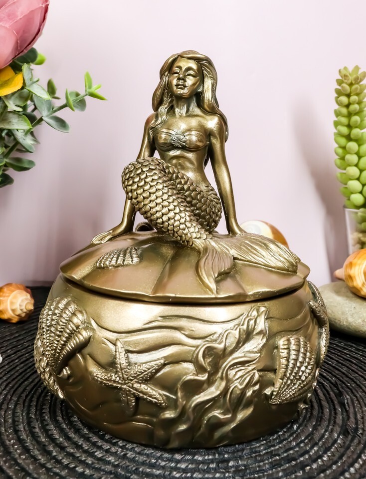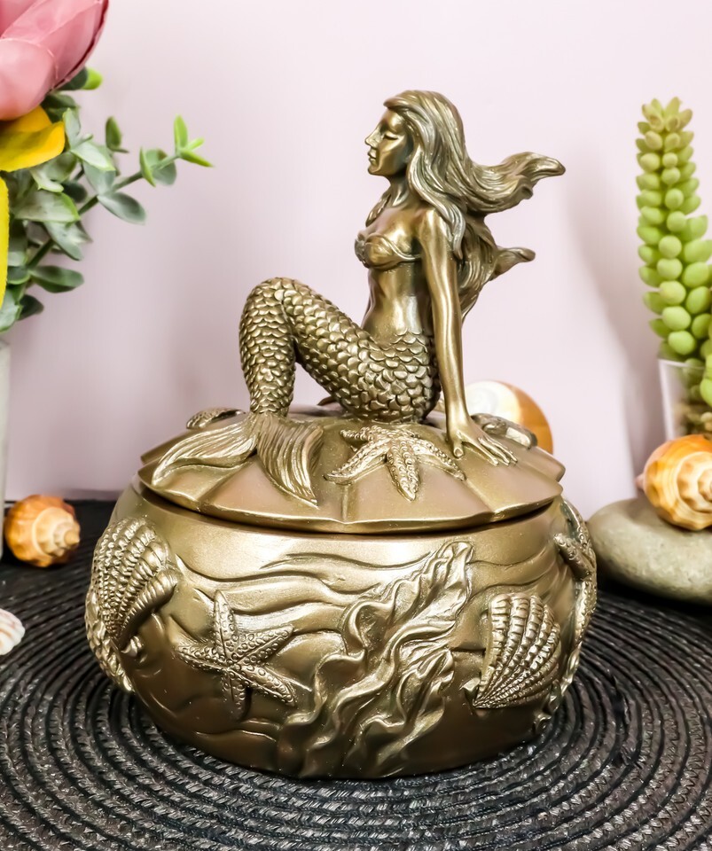 Wishing Mermaid Rounded Jewelry Box Figurine 5.5"H Coastal Reed Marine Decor