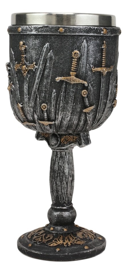 This Valyrian Steel Swords With Excalibur Sword Handle Stem Wine Goblet is made of high quality resin with stainless steel liner, individually hand painted and polished. Color Tone May vary from pictures.