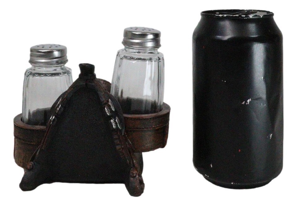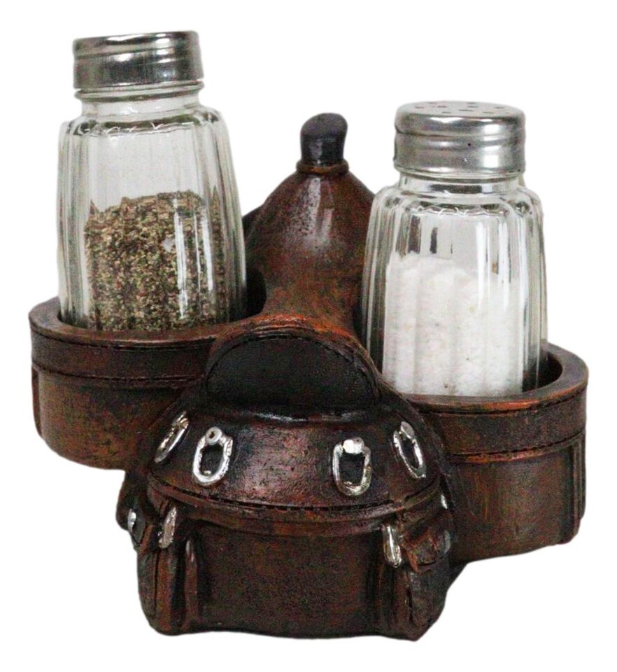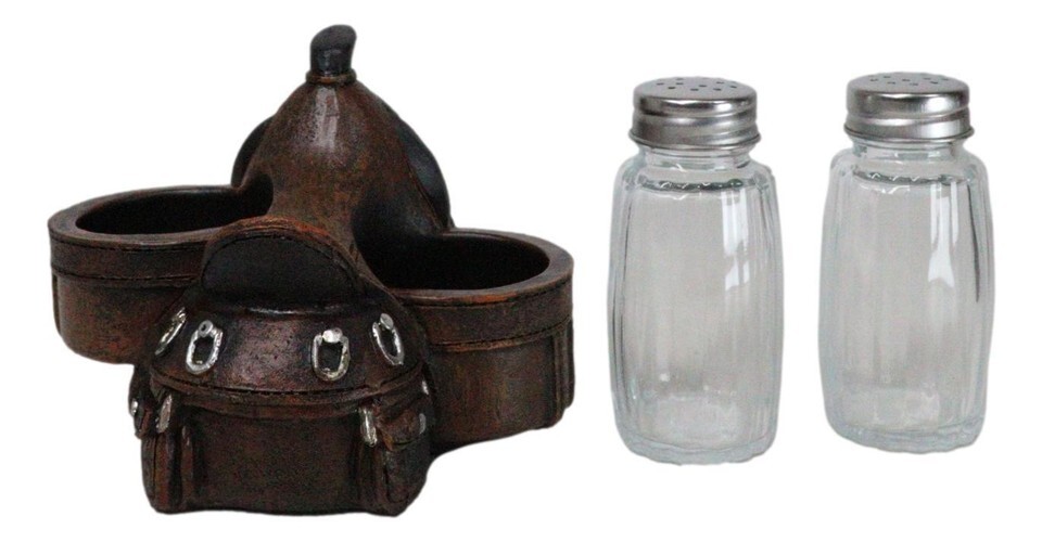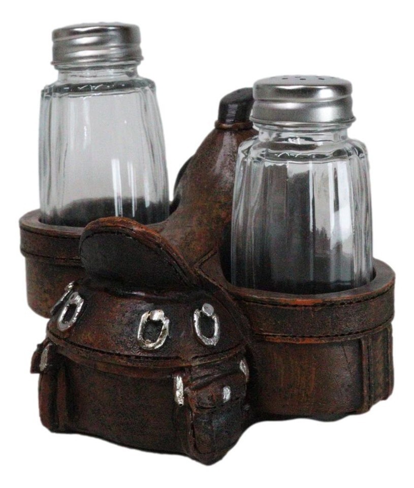 ? Add a touch of rustic charm to your dining table with our Faux Tooled Leather Cowboy Horse Saddle Salt and Pepper Shakers Holder Set. This distinctive figurine set features intricately designed shakers styled like miniature cowboy horse saddle, complete with faux tooled leather detailing. Designed to resemble a classic horse saddle, this figurine provides a charming and functional display for your salt and pepper glass shakers.