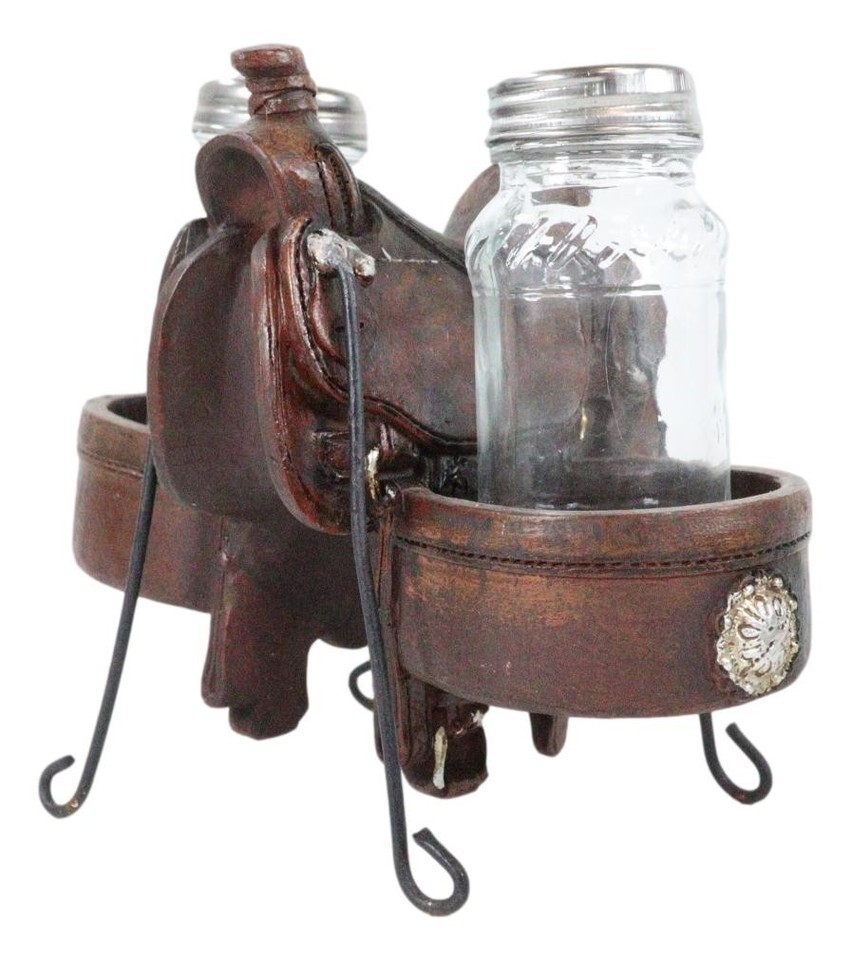? Giddy up and saddle up cowboys with this western salt and pepper shakers holder. This salt and pepper shakers holder is designed with the horse saddle theme. The horse saddle takes the center part of the sculpture, propped up by a black stand. The faux tooled leather saddle has 2 saddlebags that will hold your glass shakers.