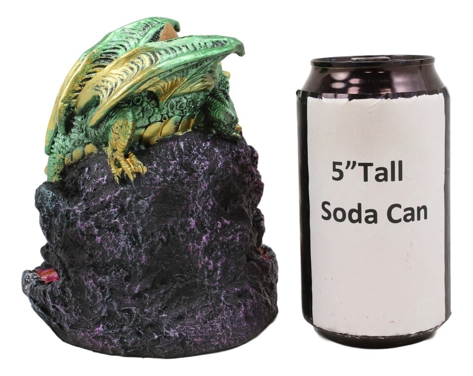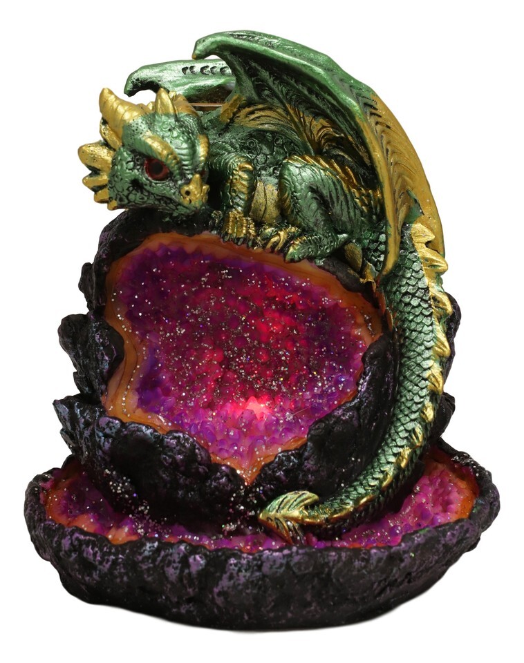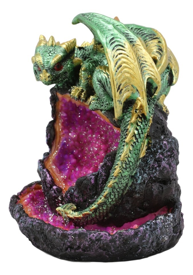 ? This stunning incense burner will delight multiple senses, both smell and sight! A shining emerald dragon with gold accents perches atop a geode. The open gemstone glitters with purple crystals, and the smoke from the incense flows down to pool prettily in the faux-stone basin. A unique gift idea for the fantasy lover in your life!
