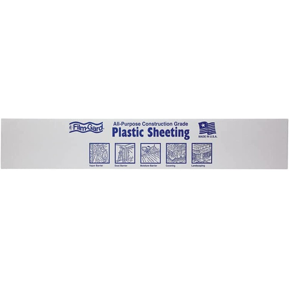 Brand Name: Film-Gard; Grade: Light Weight; Material: Plastic; Length: 200 ft.; Product Type: Painter's Plastic; Width: 12 ft.; Color: Clear; Packaging Type: Boxed; Number in Package: 1 pk; Reusable: No; Thickness: 2 mil; For dust, over spray, or room enclosure protection; Polyethylene construction sheeting