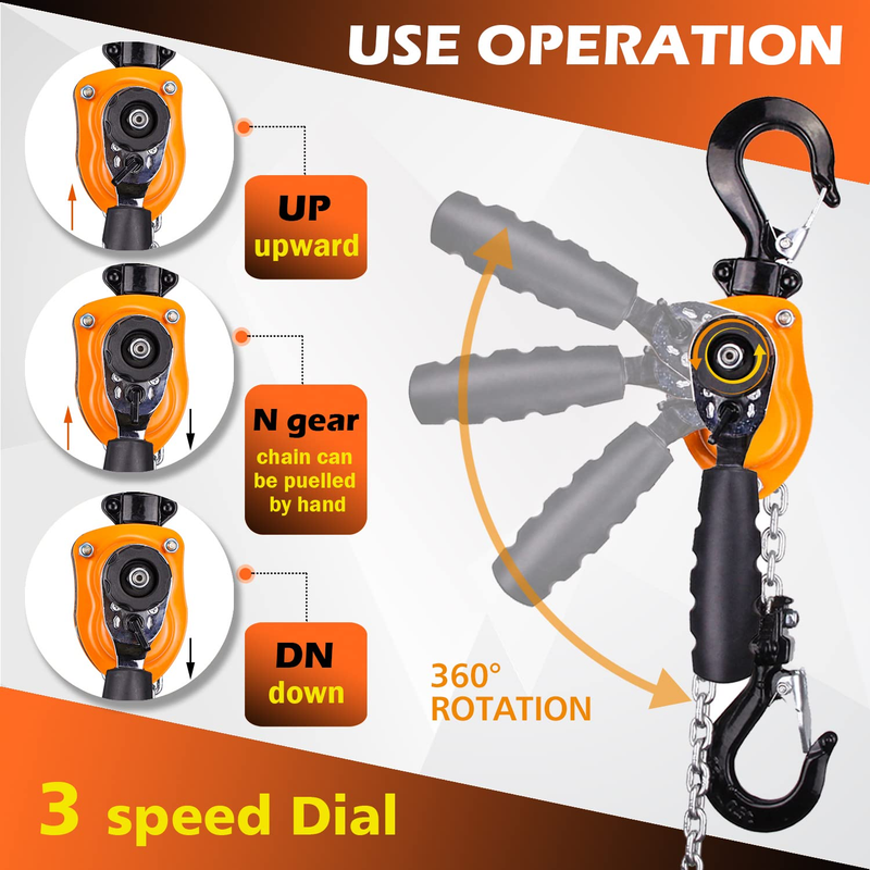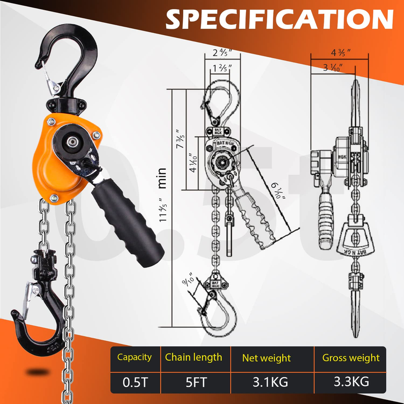 ? SPECIFICATION ?--Mini manual chain hoist capacity up to 1100lbs/0.5t, lifting height of 5ft/1.5m, steel constuction, come along tool