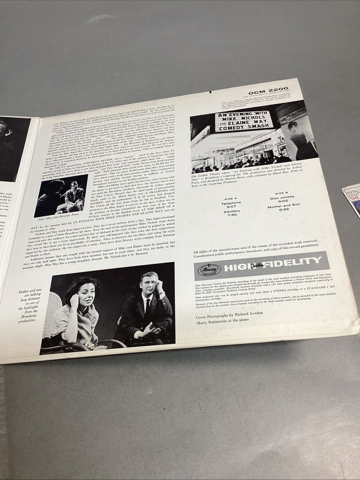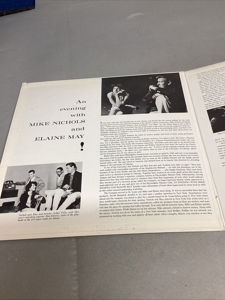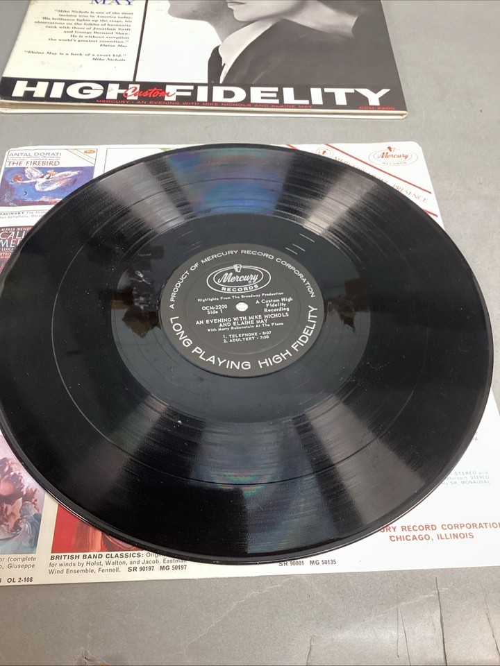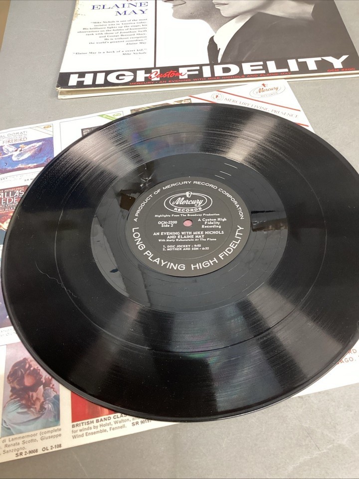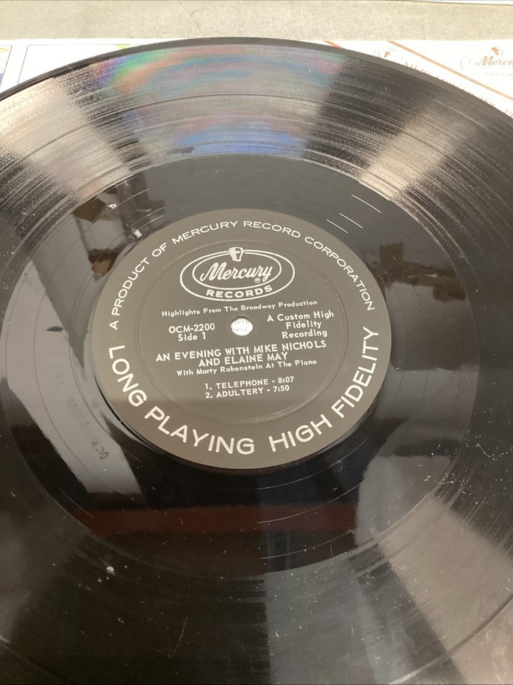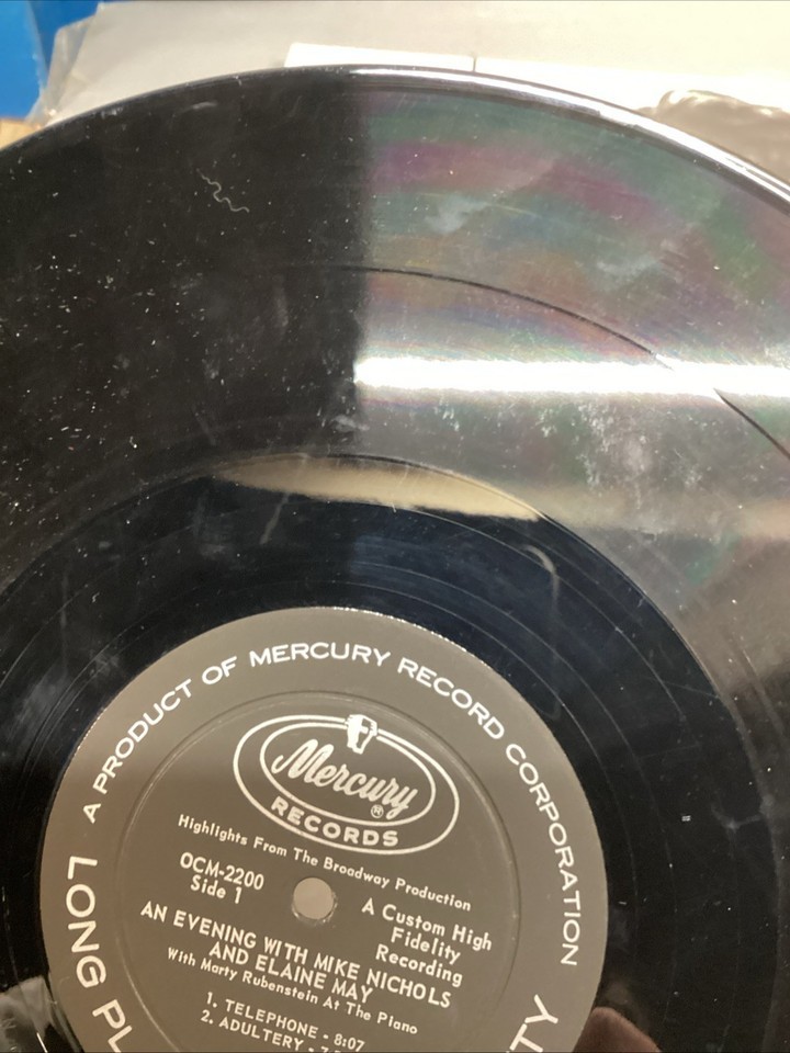 An Evening With Mike Nichols And Elaine May (Vinyl, Mercury, OCM 2200). Record is in used condition. Untested and selling as is. There are a few very light scratches (which I cannot feel) and some smudges, and fingerprints on it.