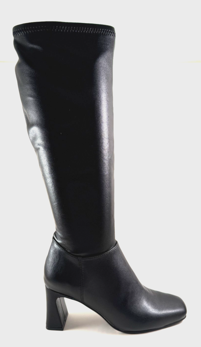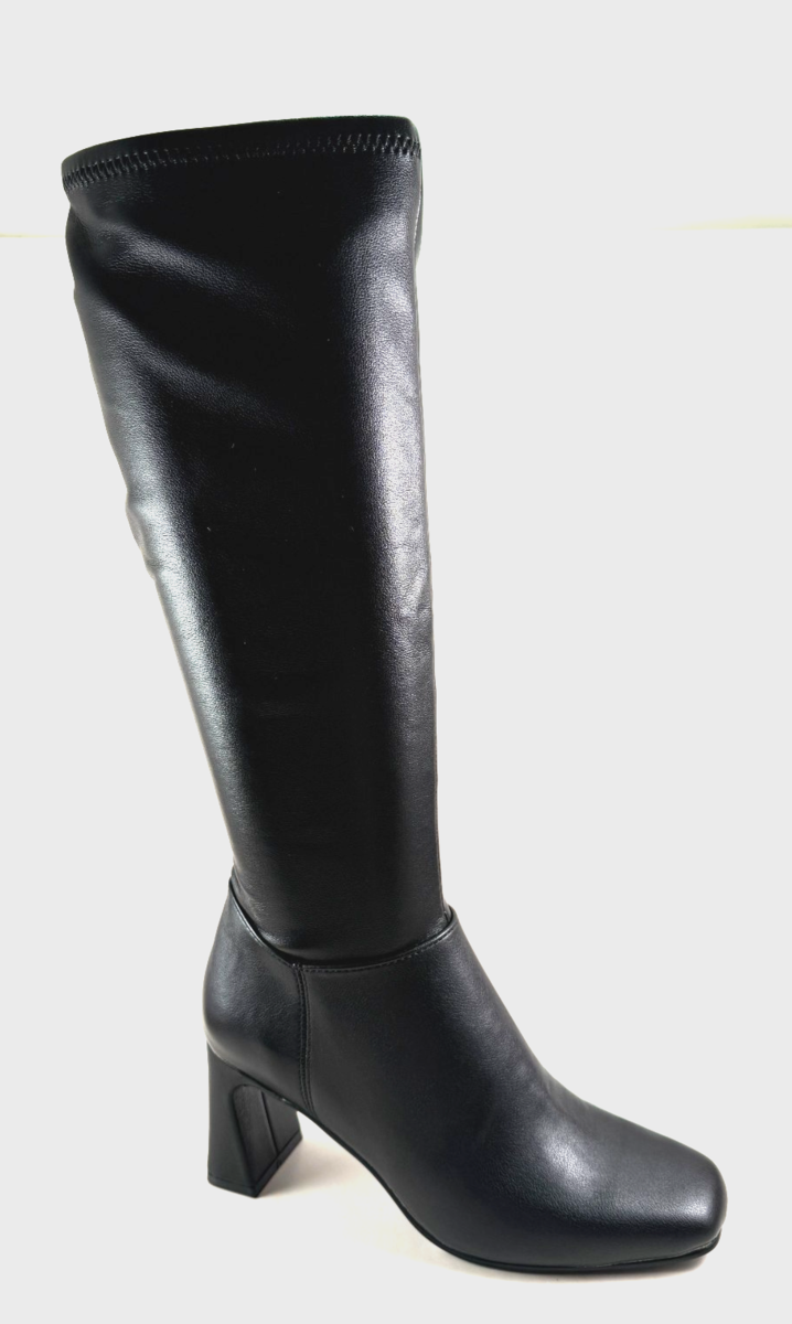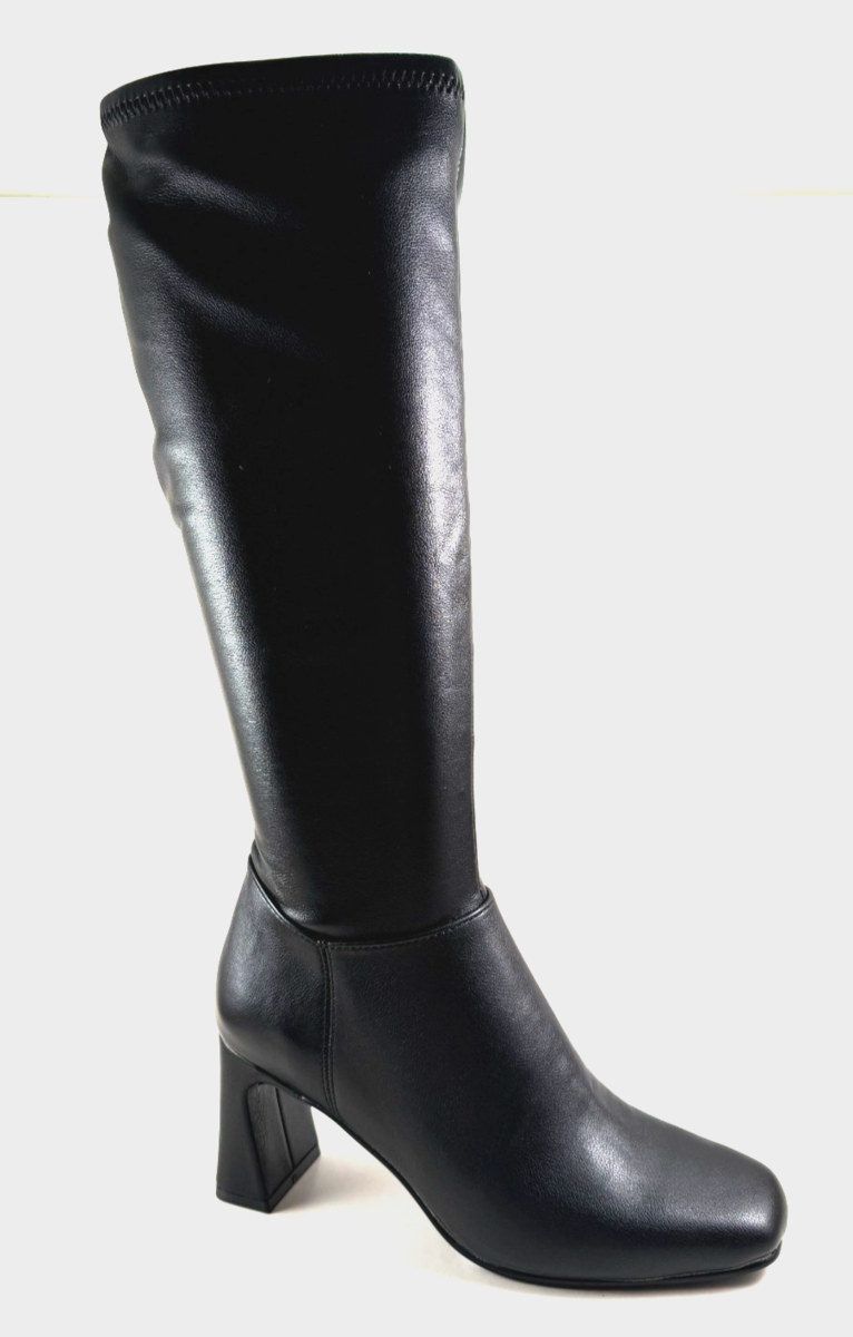 Steve Madden Hunny Black Stretch Knee High Mid Block Heel Square Toe Boot