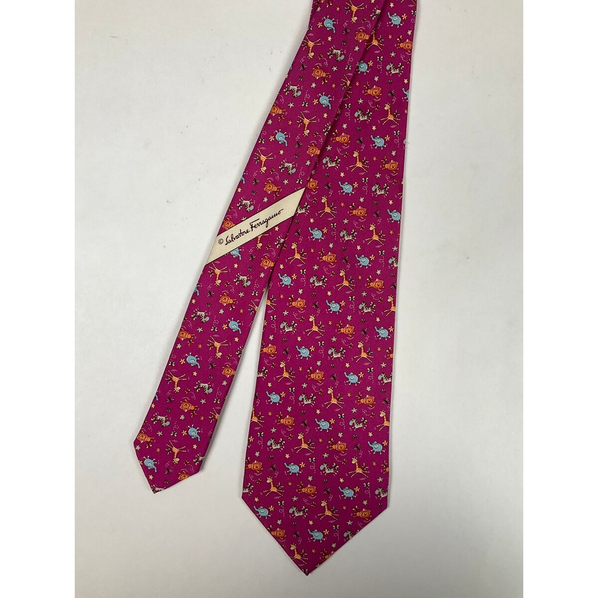Men?s Salvatore Ferragamo silk tie featuring a pink animal pattern. Like new condition. Measures 58 inches in length and 3 1/2 inches in width. Made in Italy from 100% silk. No box included.