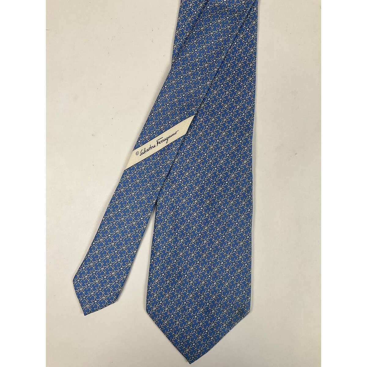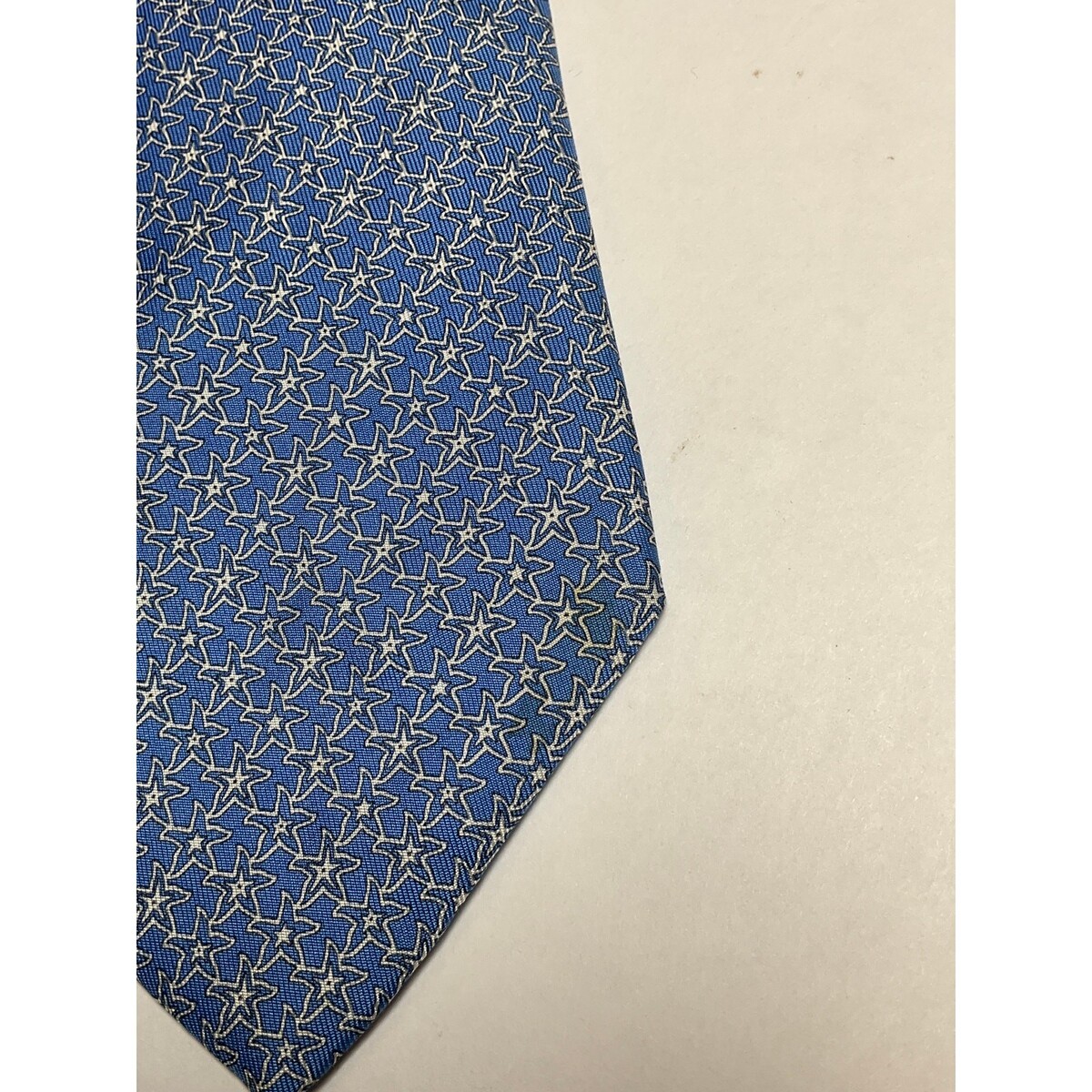 Men?s Salvatore Ferragamo silk tie featuring a starfish pattern. Excellent overall condition with a small stain that may come out with professional dry cleaning. Measures 58 inches in length and 3 1/2 inches in width. Made in Italy from 100% silk. No box included.