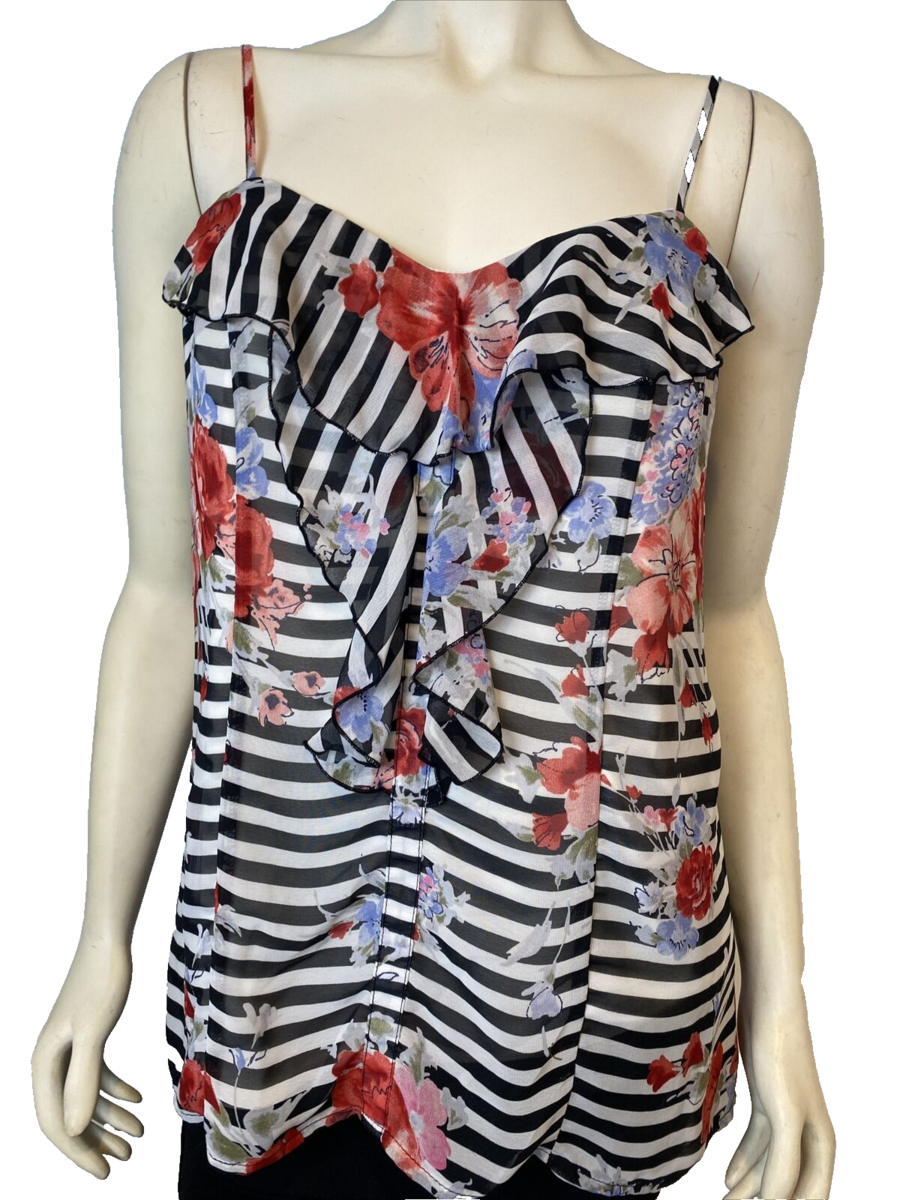 Xhilaration Black and White Striped Red and Blue Floral Spaghetti Strap Top Sz L