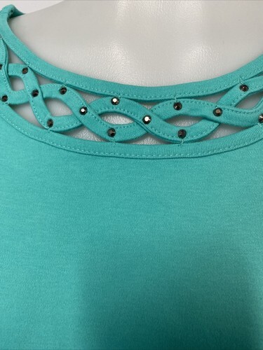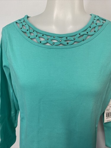Kim Rogers Vive-La France 3/4 Sleeve Lattice Neck Tee Shirt Turquoise PS NWT