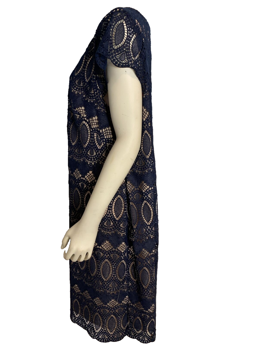 Eliza J Navy Blue Overlay Short Sleeve Dress with Tan Underdress