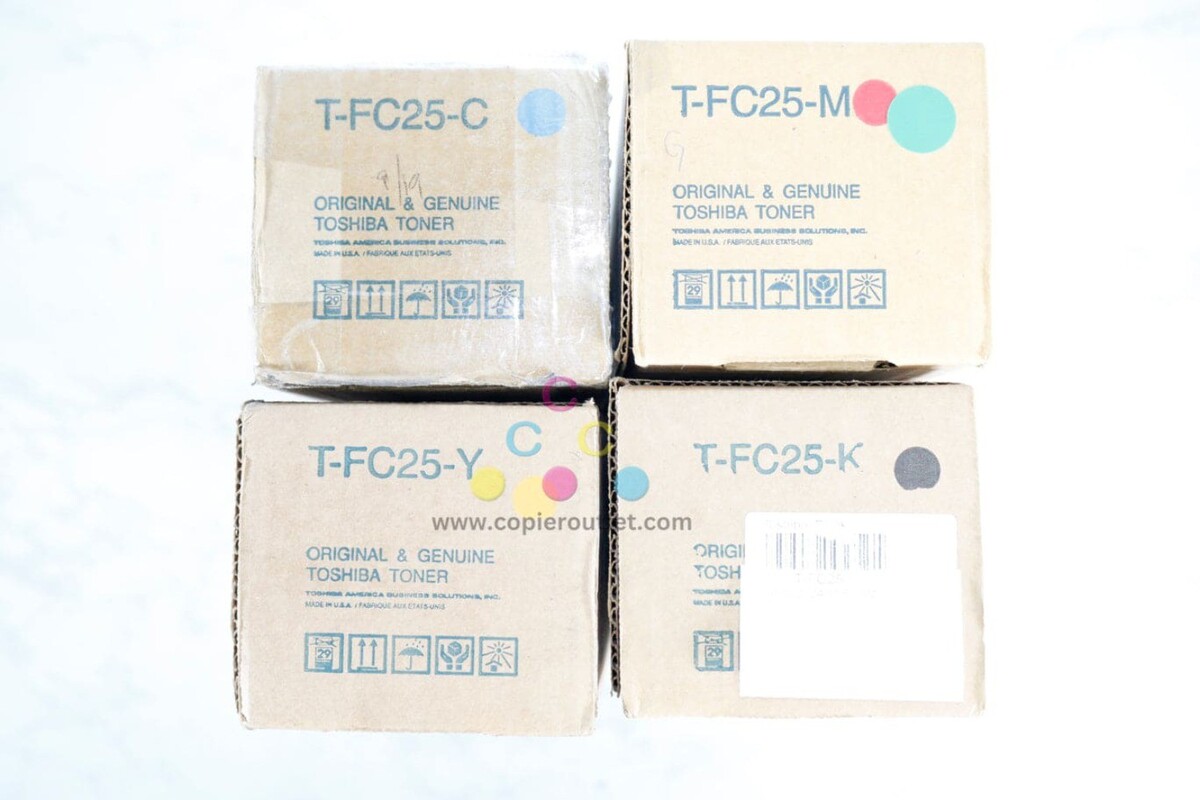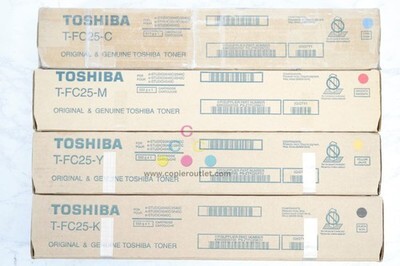 4 Genuine Toshiba T-FC25 Cyan, Magenta, Yellow, Black Toners T-FC25-C/T-FC25-M T-FC25-Y/T-FC25-K For e-STUDIO 2040C/2540C/3040C/3540C/4540C New! Same Day Shipping!!! For faster shipping service, please send us a message or contact us. Copier Clearance Center Copier Clearance Center was established in 1993. We buy and sell both domestically and internationally and have wide assortment of used copiers, fax machines and printers of all brands, All of our copiers are in house and available for your inspection. They all have been tested and rated for functions, cosmetics and overall appearance. We also sell genuine accessories of all popular brands, Our accessories include toners, imaging units, developers and copier parts such as fax board, fixing unit, fuser unit, roller, cleaning brush, drum blades etc. For more detailed information on our current inventory of Copiers and Accessories all potential buyers or their representatives are welcome to give us a call. We are more than happy to assist you with the pricing and guide you to find the copiers you wish to buy. Best Regards, On-Line Sales Team Copier Clearance Center Business Hours (Pacific Time): Monday-Friday: 8:30 am to 5:00 pm Copier Clearance Center Promo Video - YouTube Video will open in a new windowUsing the App? Paste link into a browser window: [isdntekvideo] All product and company names are trademarksTM or registered trademarks of their respective holders. Use of them does not imply any affiliation with or endorsement by them.