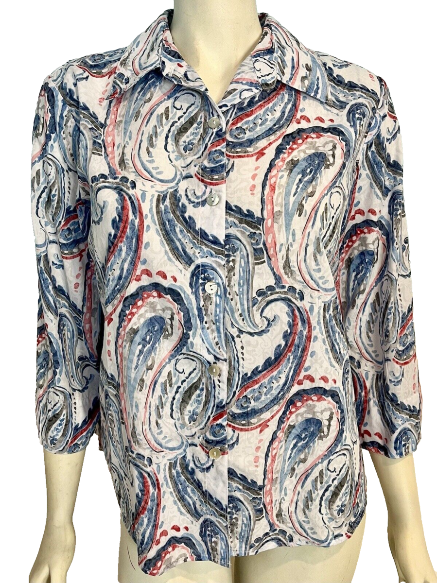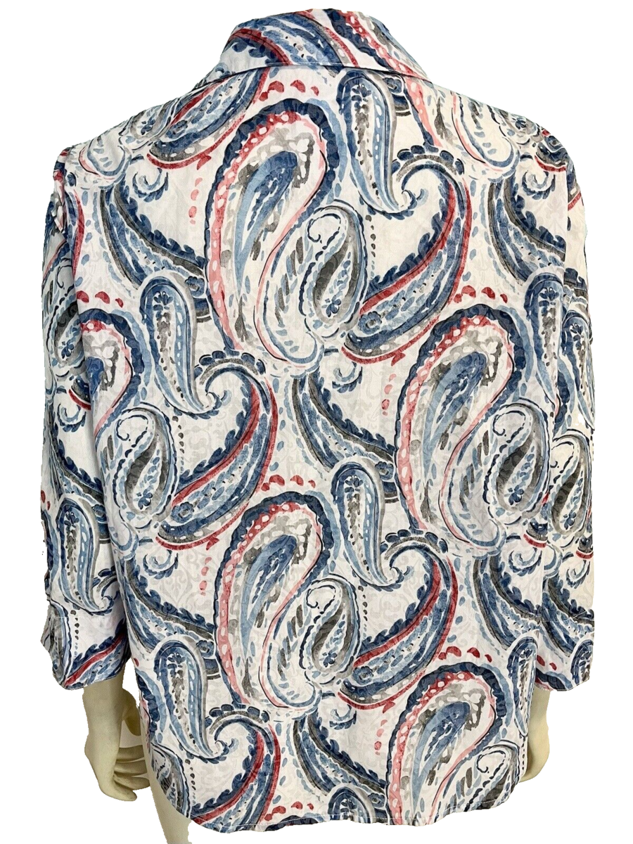Alfred Dunner Petite White, Blue, Red Print 3/4 Sleeve Blouse PM