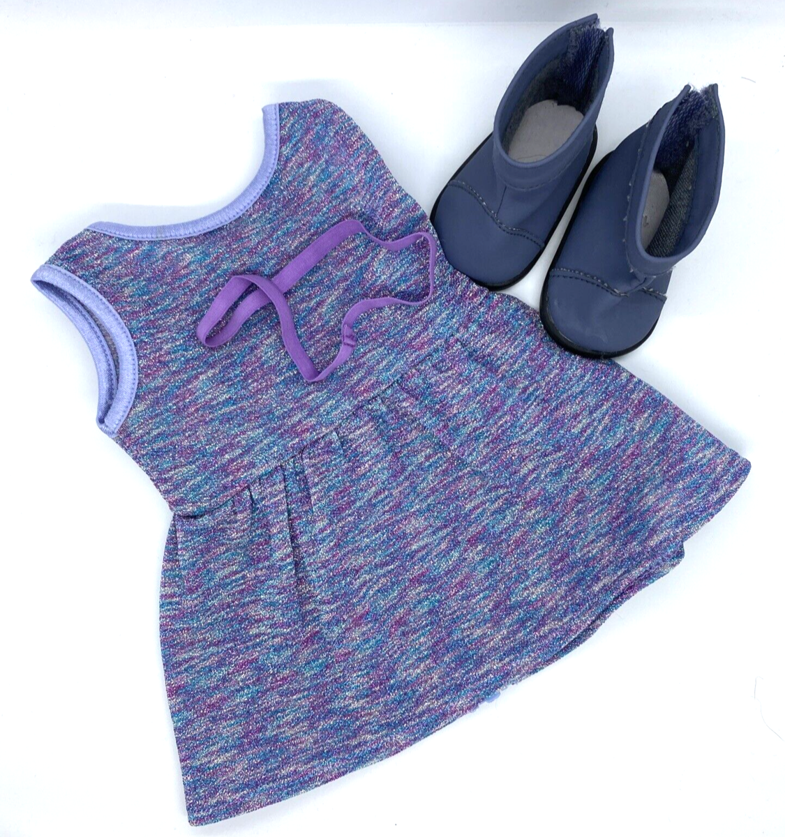 American Girl Sparkly Blue, Purple and Pink Dress, Purple Headband, Blue Boots