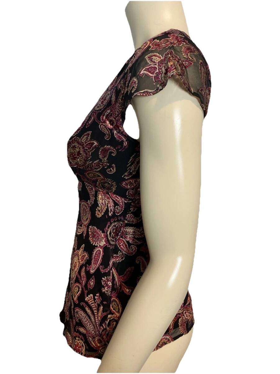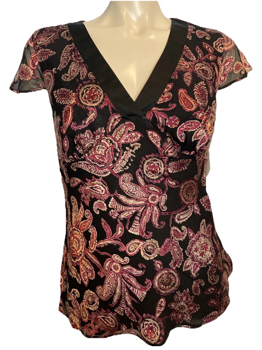Ann Taylor Loft Black, Tan, Pink V Neck Capped Sleeve Lined Top Paisley Size 2