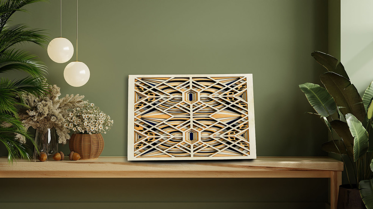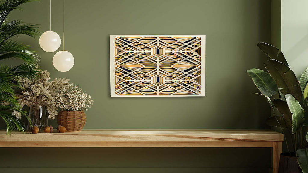 Add structure and sophistication to your space with this geometric wood wall art, handcrafted from six precision laser-cut wood layers for striking depth and symmetry. Inspired by Art Deco design, this piece features repeating geometric patterns and clean lines, blending natural wood tones with a bold dark blue backdrop for a modern yet timeless look.