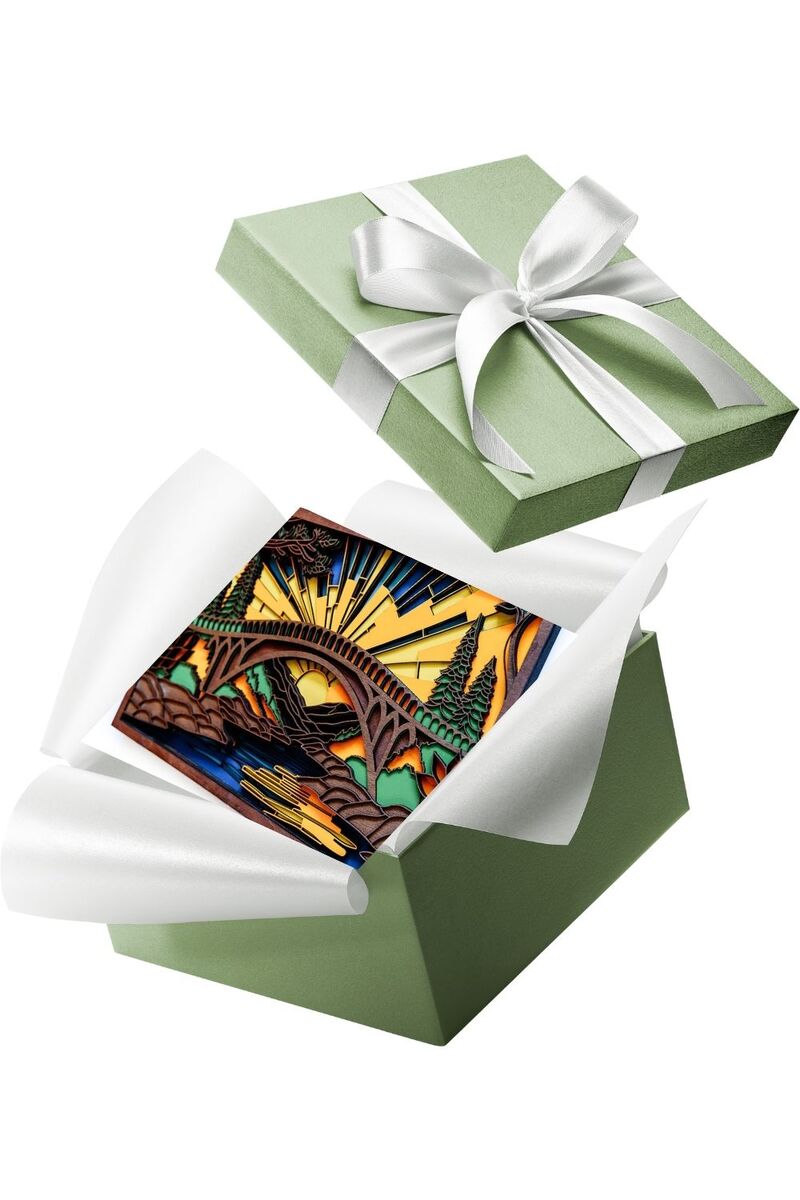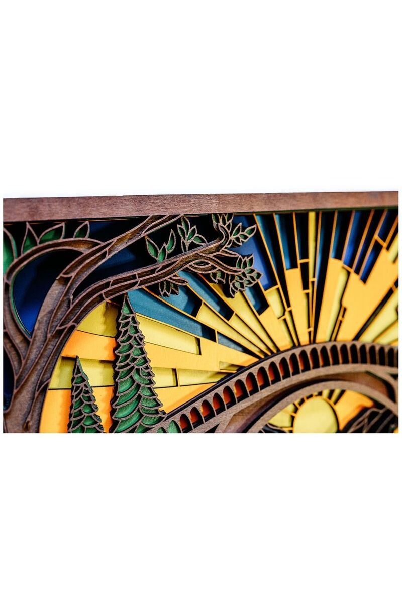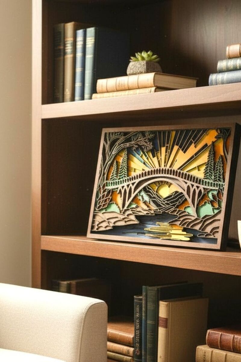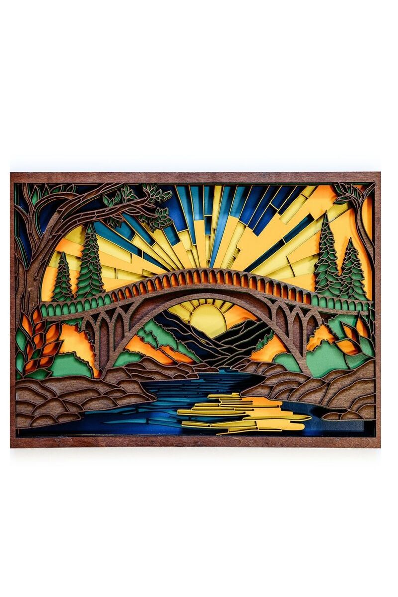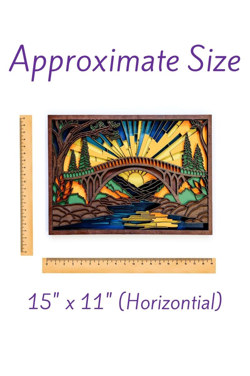 This handcrafted wood wall art features a swinging bridge scene made from 8 layers of laser-cut basswood. The layered design creates depth and texture, making it perfect for living rooms, cabins, cottages, and nature-themed spaces.
