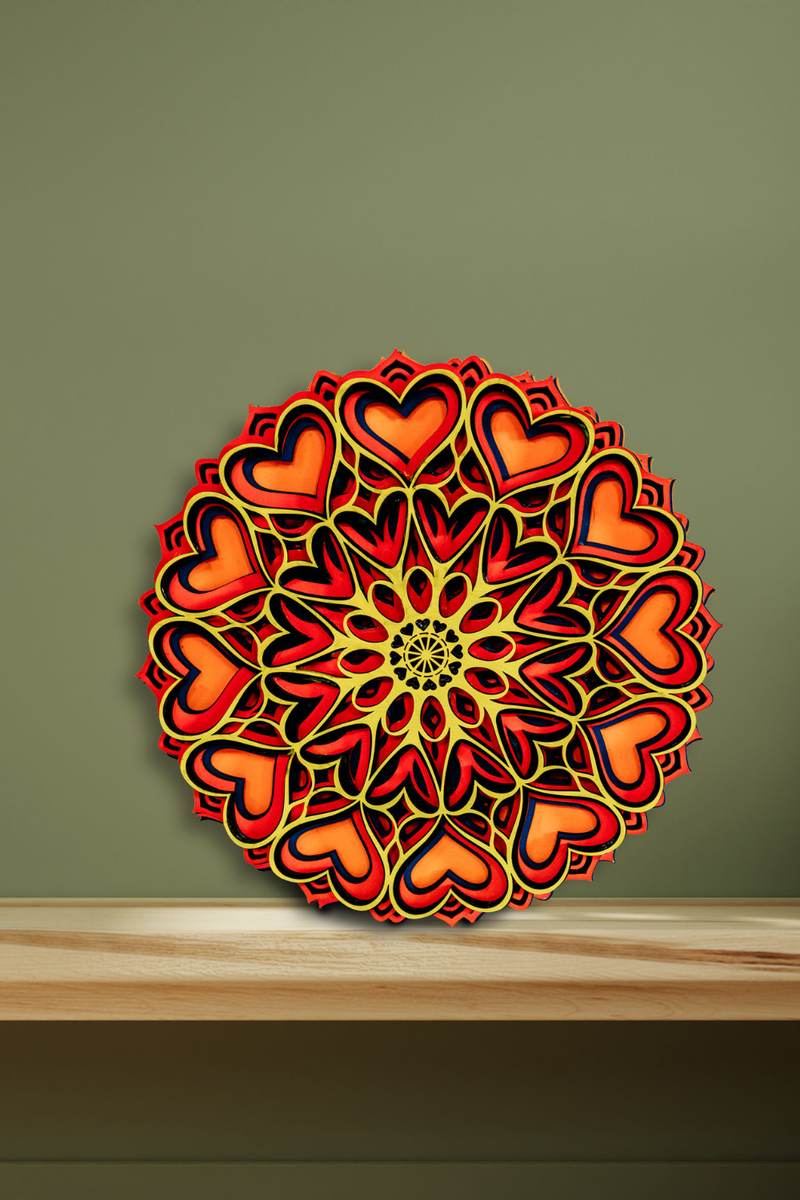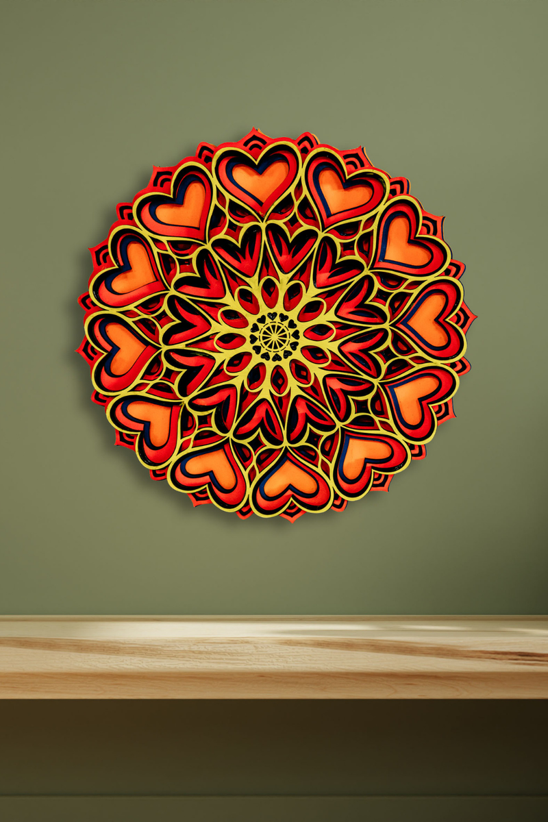 Make a bold and expressive statement with this Heart Mandala wood wall art, handcrafted from six precision laser-cut painted plywood layers to create striking depth and vibrant color. Featuring an intricate mandala made entirely of heart-shaped details, this piece blends emotion, symmetry, and modern design into a powerful focal point for any space.