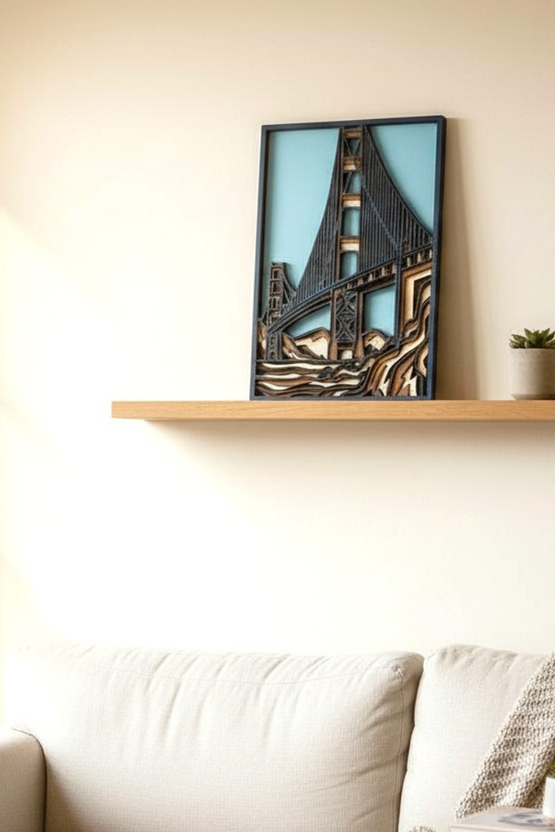 Bring the beauty and strength of the Golden Gate Bridge into your home with this handcrafted layered wood art piece. Each layer is laser-cut, hand-stained, and individually assembled to create depth, dimension, and a warm artistic feel.