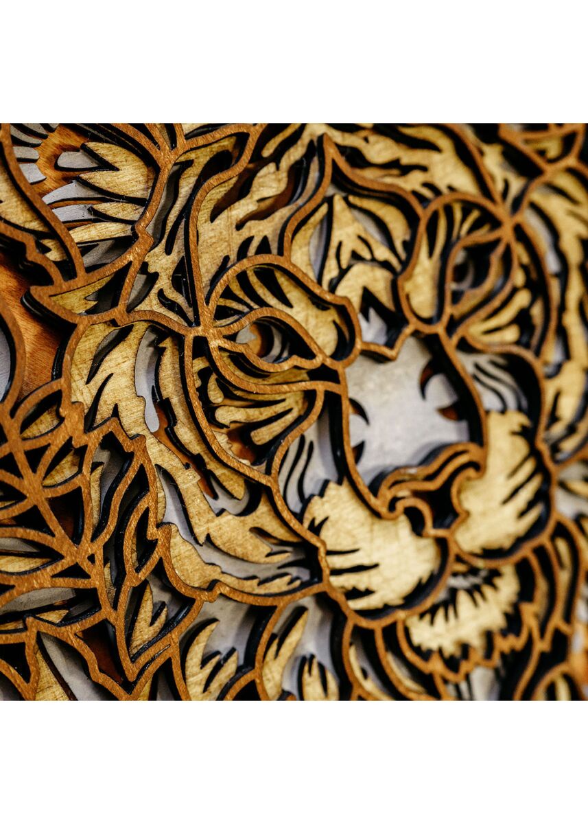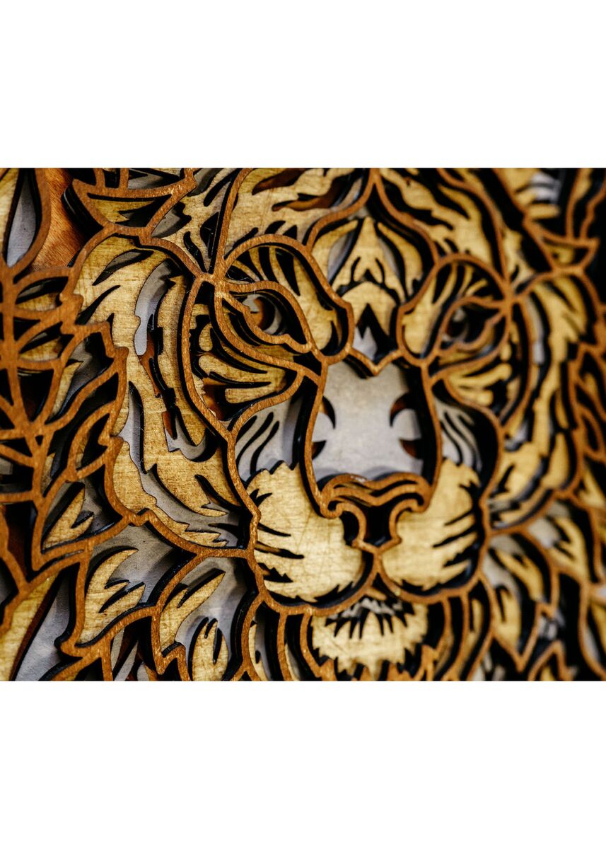 Each layer is carefully cut, hand-stained, and assembled to showcase the powerful presence of the lion combined with the flowing detail of a mandala design. The natural wood tones add warmth and texture, making this piece both bold and calming.