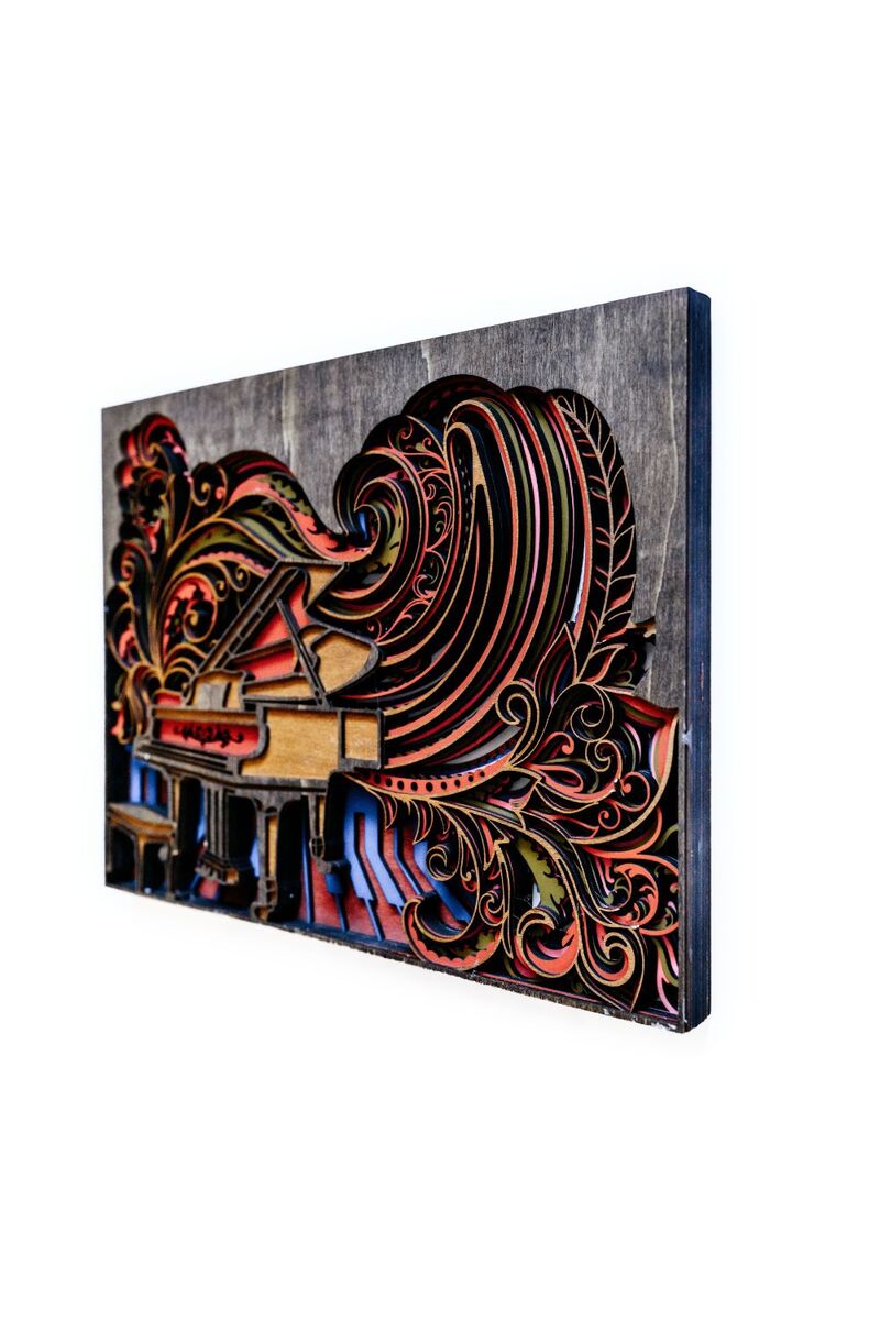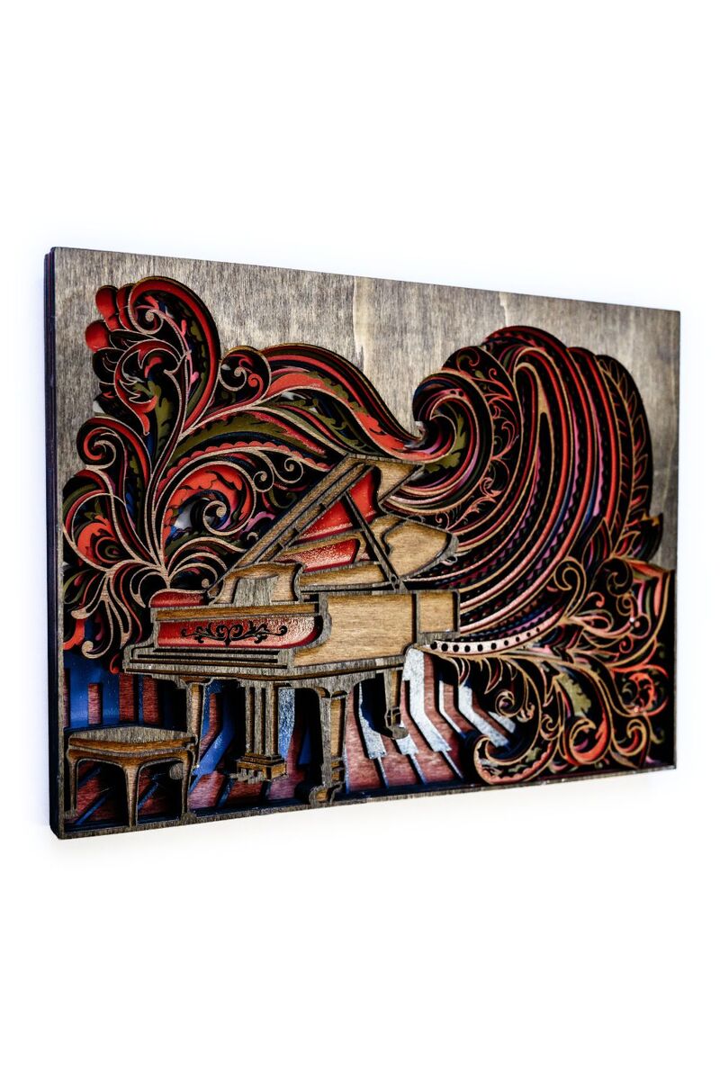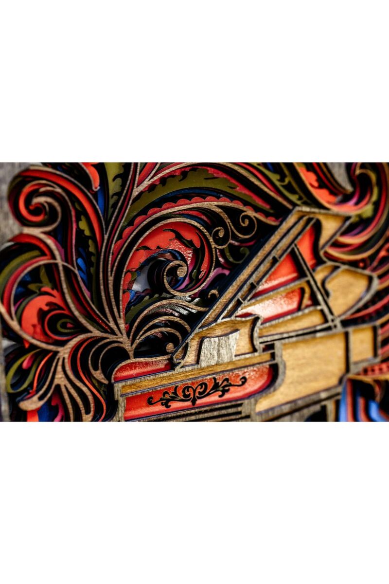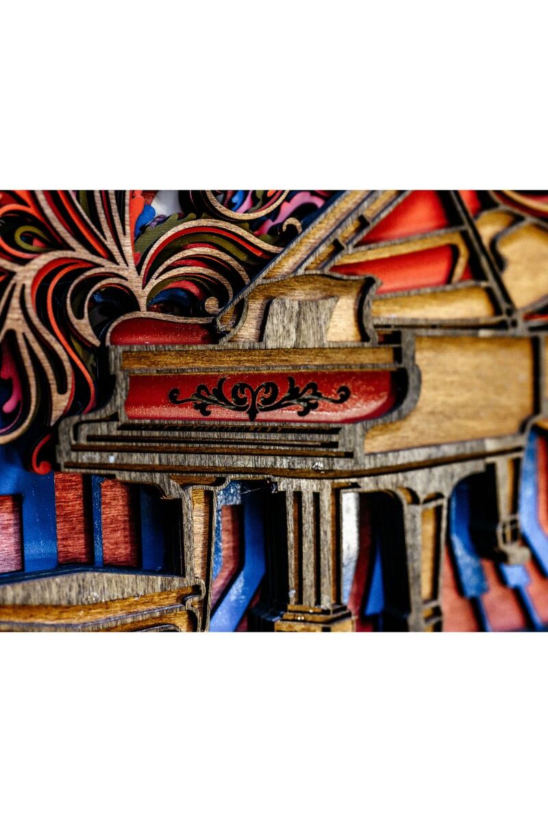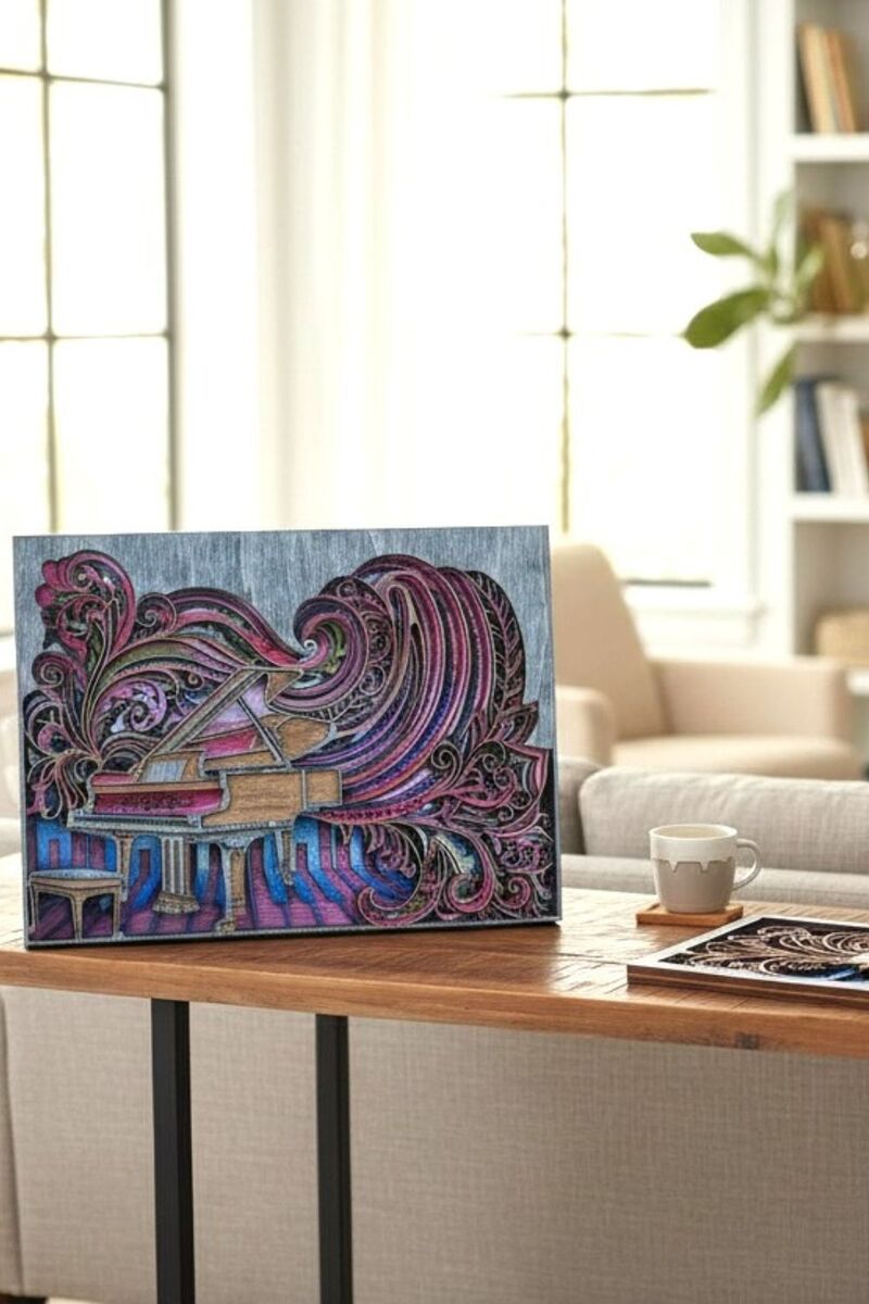 This handcrafted 15x11 design features a grand piano surrounded by flowing, colorful swirls that represent rhythm, motion, and creativity. Every layer is laser-cut with precision, then hand-finished to create depth, color, and movement in your space.