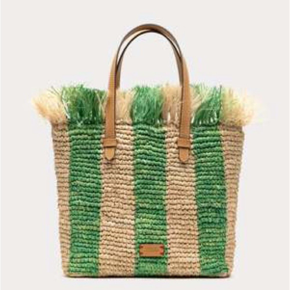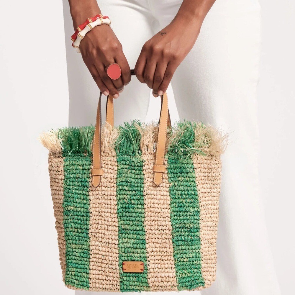FRANCES VALENTINE Alfie French Straw & Leather Tote Bag, Green Stripe, NWT