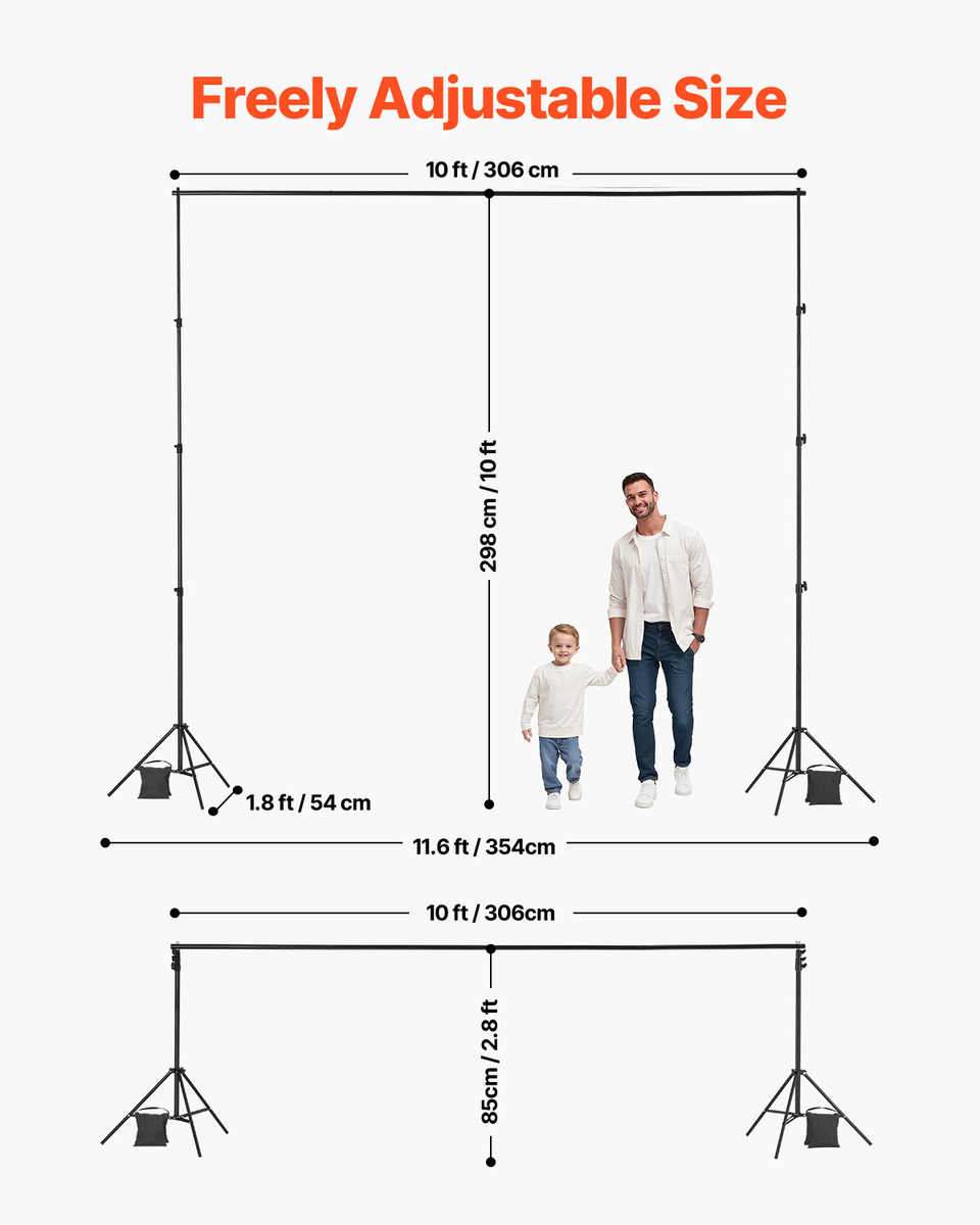 Adjustable Size: Our adjustable backdrop stand supports backdrops up to 10 x 10 ft / 298 x 300 cm. The support poles can extend from 2.8 ft / 85 cm to10 ft / 298 cm to fit different backdrop sizes. Note: This product does not include balloons, decorative items, or backdrop fabric.