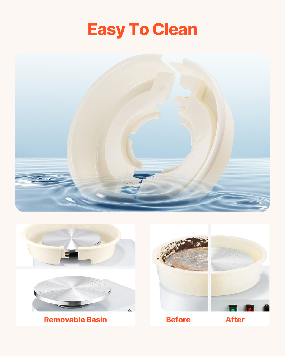 Premium Quality: 14in / 35cm large aluminum alloy turntable allows users to draw large pieces quickly. Durable ABS water basin attached to stop mud from splashing and is detachable for easy cleaning. Compact structure with humanized design and excellent details provide users with a more enjoyable experience. Enjoy pottery and sculpting from the comfort of your home