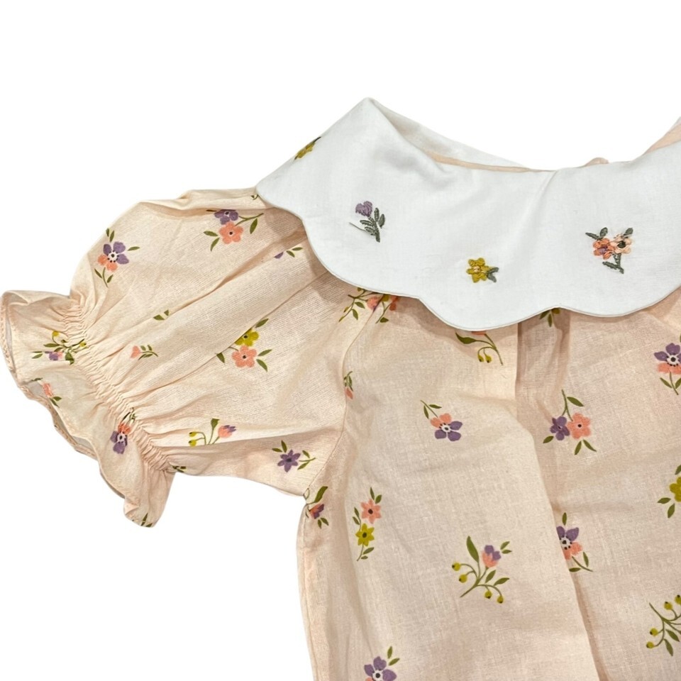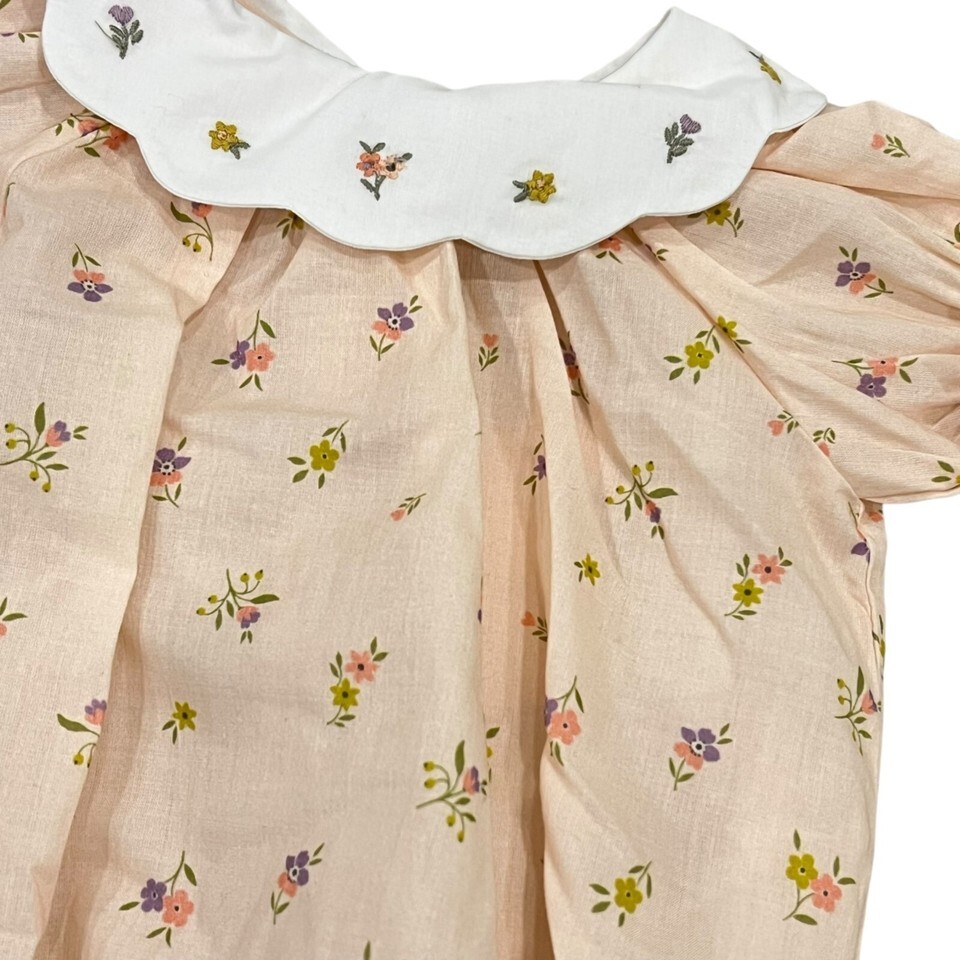 Dress your baby in this charming romper featuring a Peter Pan collar and delicate floral pattern. Its soft fabric ensures comfort for your little one.