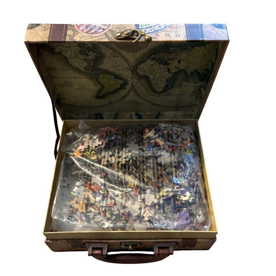 A travel-inspired jigsaw puzzle stored in a decorative suitcase-style box. Ideal for puzzle enthusiasts or as a unique gift.