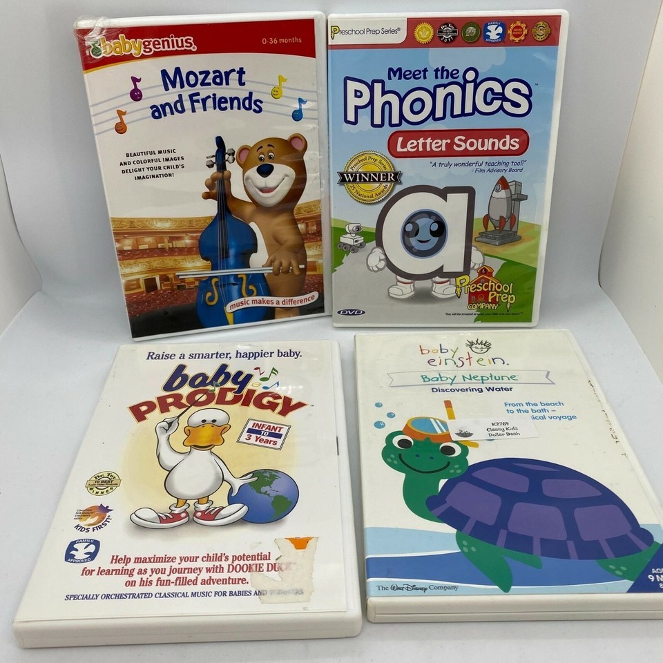Set of 4 DVDs in excellent condition, from a smoke free and pet free home. Mozart and Friends, Phonics Letter Sounds, Baby Prodigy, and Baby Einstein Baby Neptune.