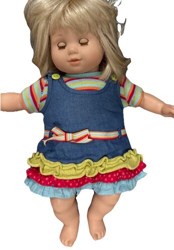 This 15? doll raincoat features charming blue stripes, a hood, and playful fish embroidery. Yellow pockets add a pop of color, enhancing its cheerful design.