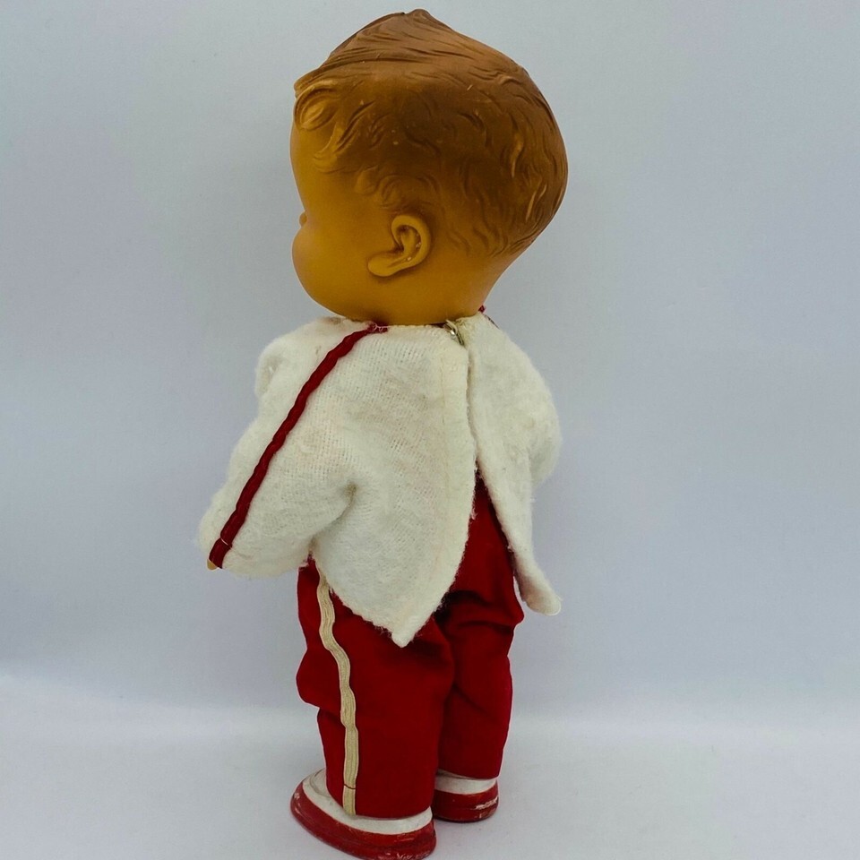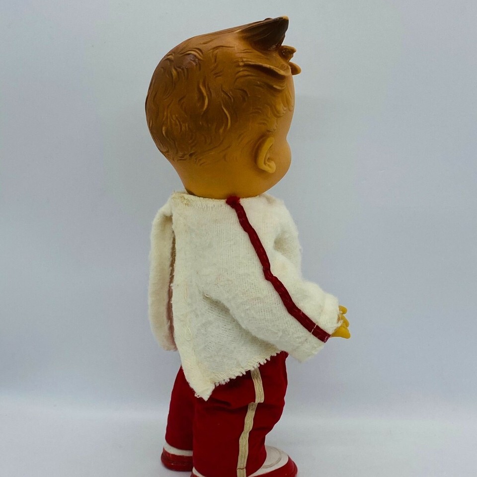 This vintage boy with stunning blue eyes is wearing a white sweater with a "4" on it, red pants and white socks, red shoes. He is in excellent condition, harder plastic, from a smoke free and pet free home.