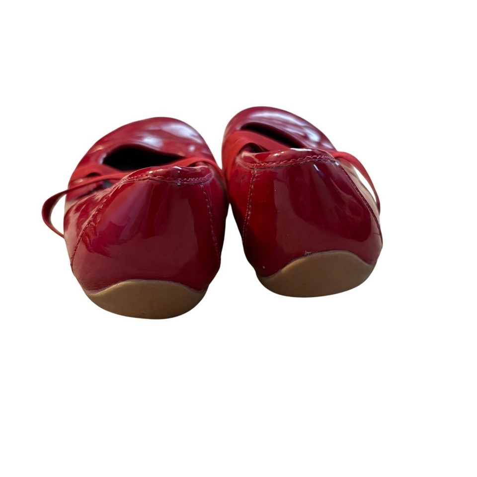 Stylish and comfortable red patent shoes with elastic straps offering a snug fit. Durable soles ensure lasting wear for various activities.