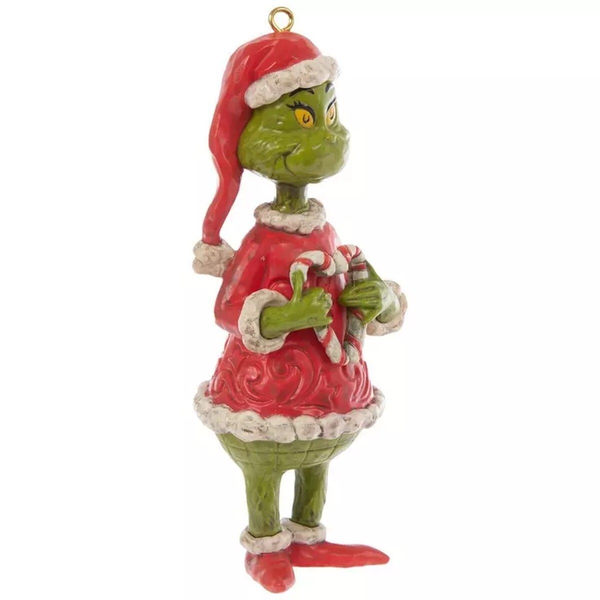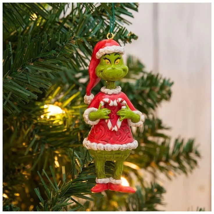 Complement your whimsical Christmas tree with this Jim Shore Grinch Ornament! This darling piece is designed to look like the Grinch wearing a Santa outfit. He is seen holding two candy canes that form a heart, giving it a sweet touch. Display it with its jute rope string to add a fun look to your holiday scene!