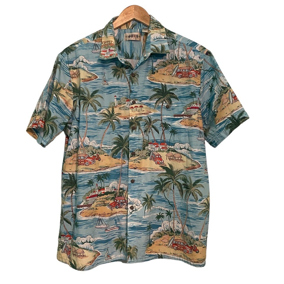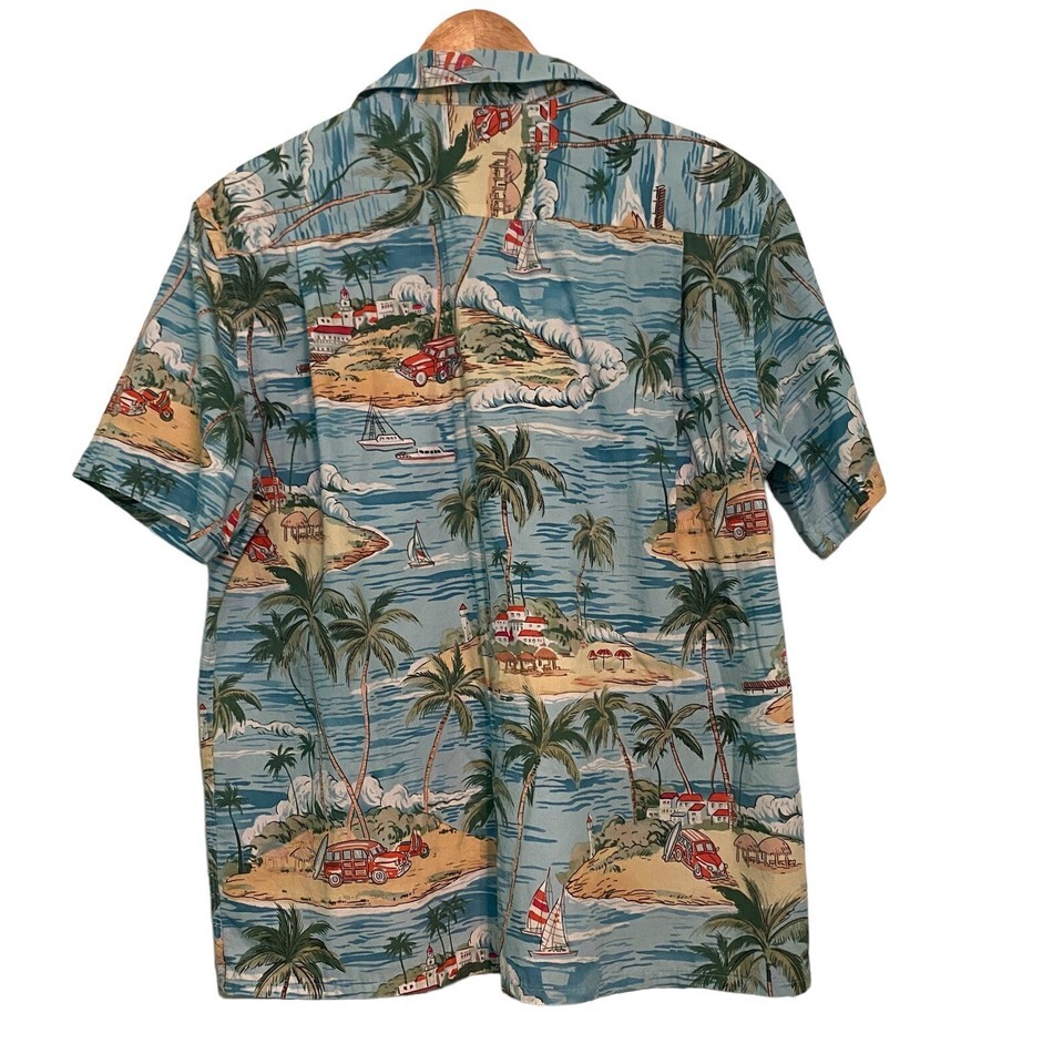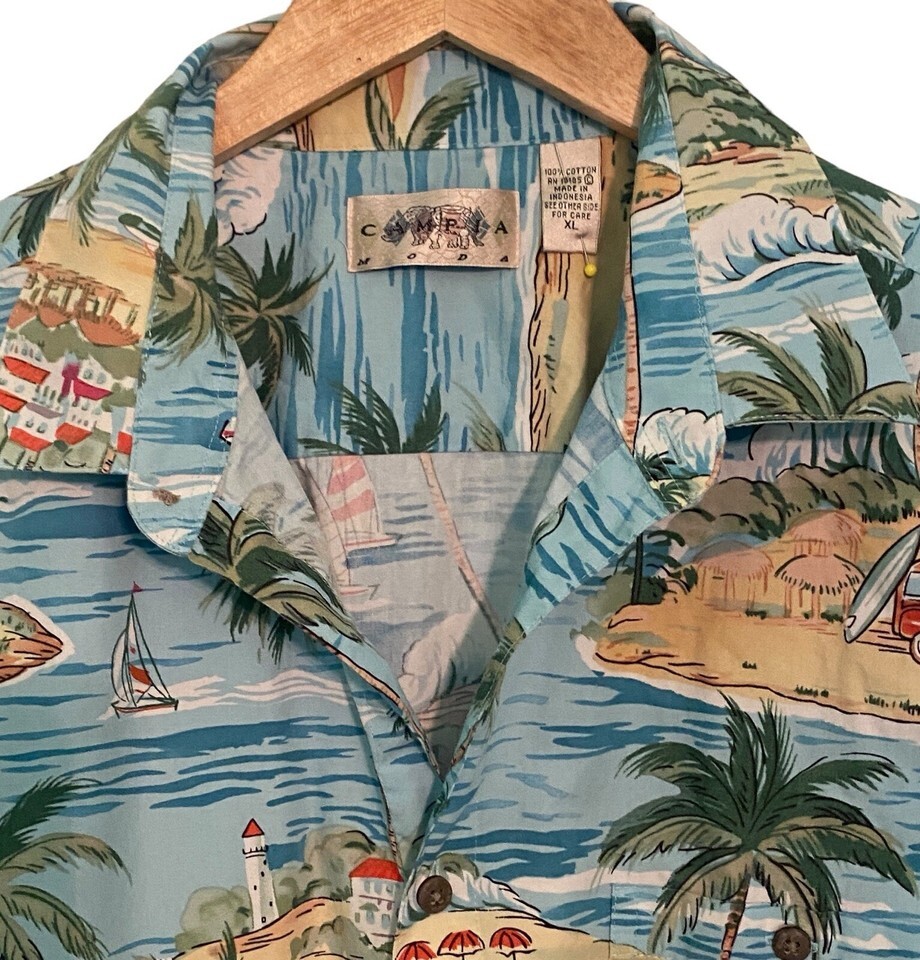 Mens Hawaiian XL Camp Shirt Button Up Palm Trees Woody Huts Sailboats Cotton