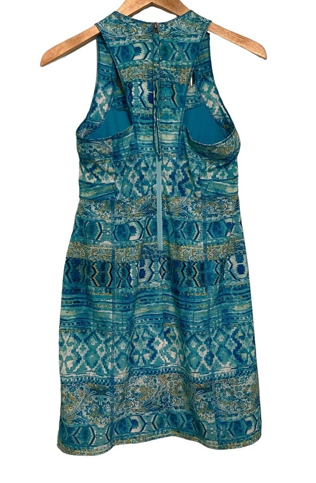 Title Sleeveless Dress Built in Bra Print Dress Size 4 Zipper Pocket Teal Blue