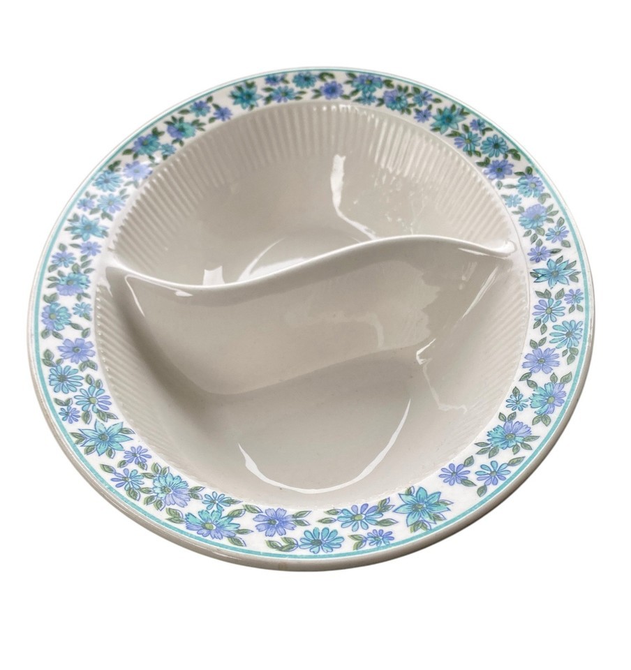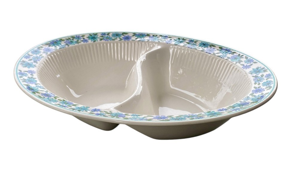 Divided Bowl Serving Vegetable Blue Purple Flowers Japan VTG