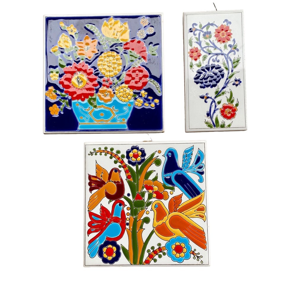 Ceramic Tiles Made in Greece Hanging Birds Floral Bouquet Lot of 3 Colors Chip