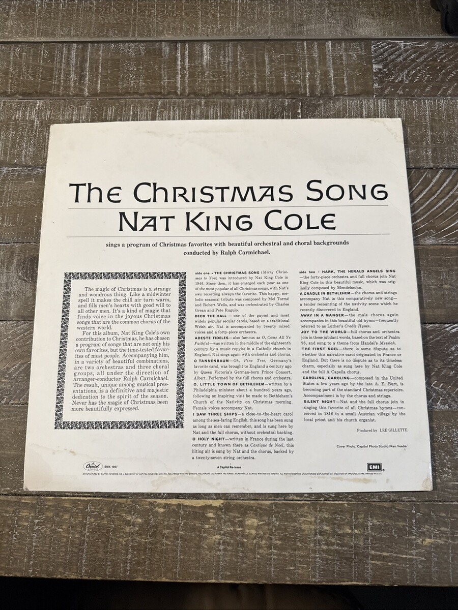 The Christmas Song Nat King Cole Album is a classic vinyl record featuring the timeless holiday tunes sung by renowned artist Nat King Cole. This album captures the essence of Christmas with Cole's smooth vocals and soulful melodies, making it a must-have for any music lover or collector of holiday music. Immerse yourself in the festive spirit and enjoy the iconic sound of Nat King Cole with this beautifully crafted vinyl record.