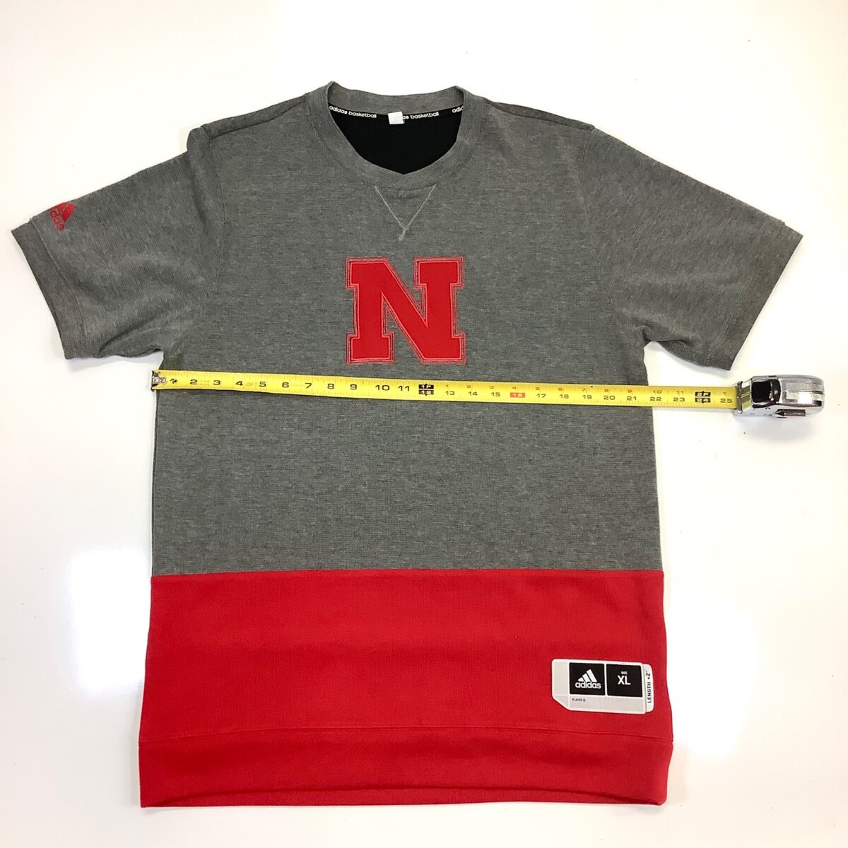 Nebraska Cornhuskers adidas Short Sleeve Shirt Gray Red. Really nice overall condition. Men's size XL (+2 inches). Please see all photos. Photos include measurements for armpit to armpit and for top of shoulder to bottom of shirt.