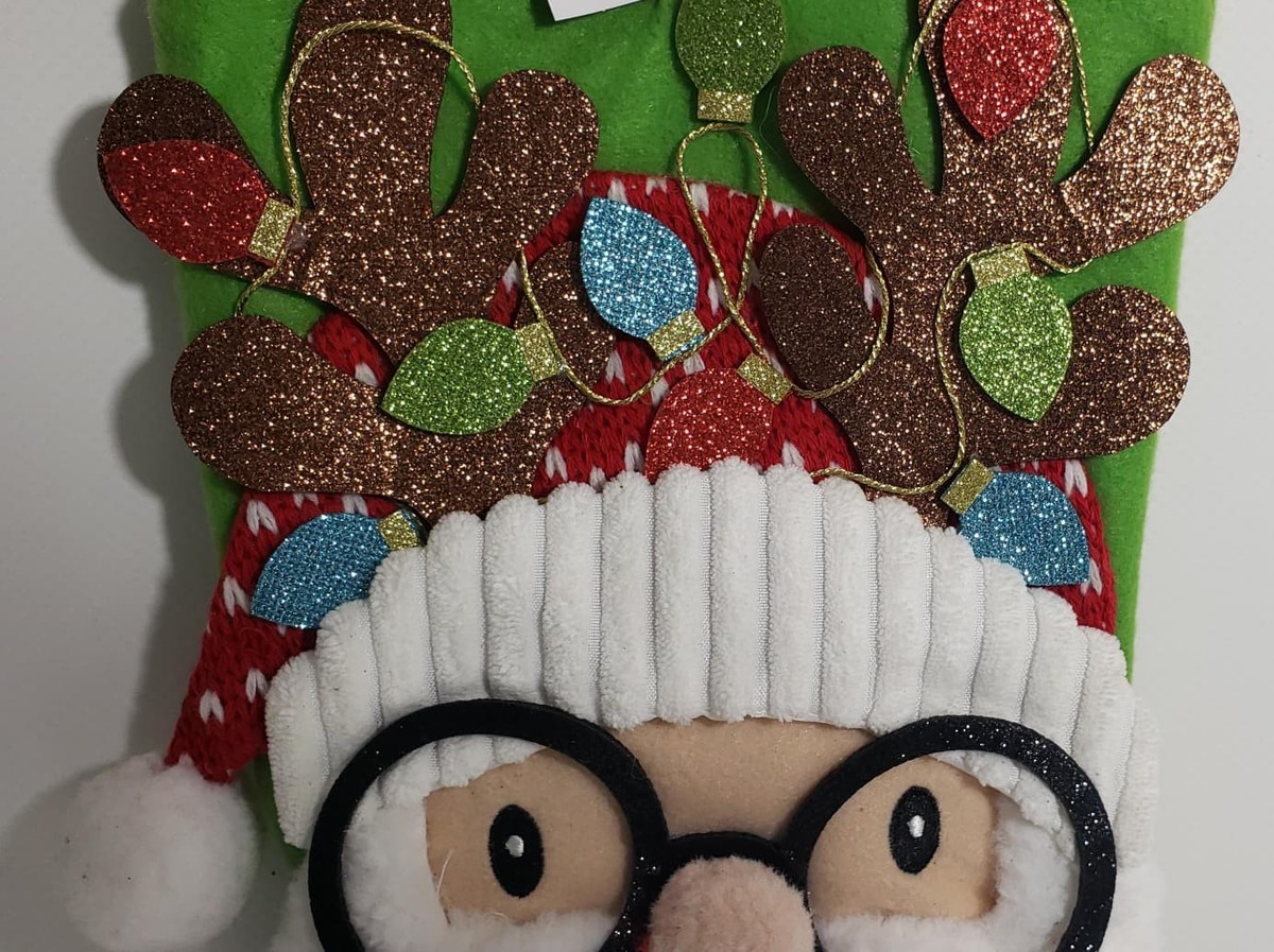 This large green stocking features a reindeer shape,