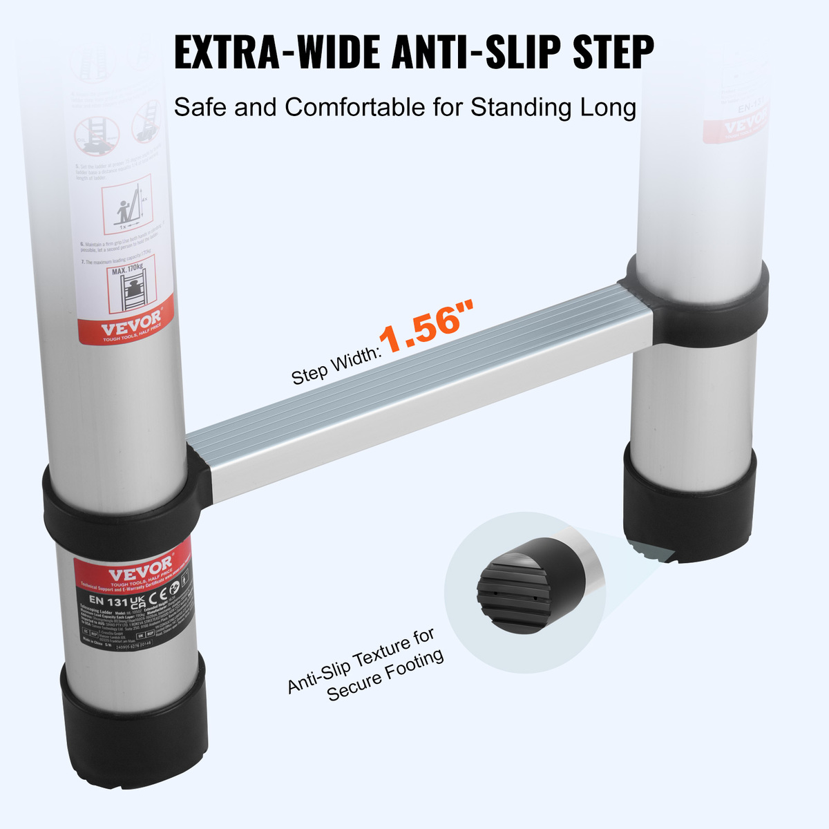 Widened Rungs: The rungs are widened to 1.56 inches, offering a more comfortable and stable standing surface that effectively reduces fatigue during prolonged standing, allowing you to easily complete various high-altitude tasks.