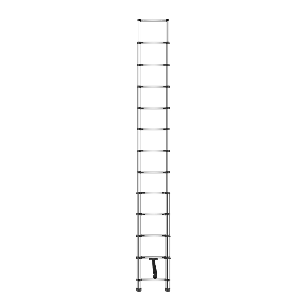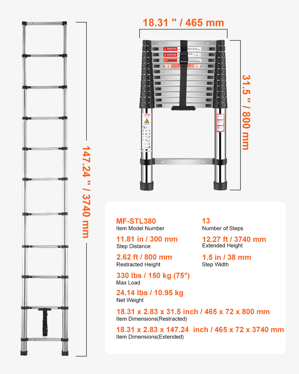 Versatile Design: This telescopic ladder offers a retractable design that allows for manual height adjustment. When fully extended, it reaches 12.27 ft, and when contracted, it is just 2.62 ft in height