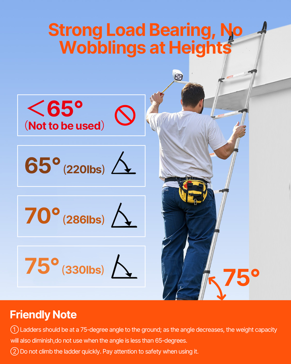 Sturdy and Durable: Our telescoping ladder is made from tough steel and reinforced with nylon connectors for added strength and durability, supporting up to 330 lbs / 150 kg?75?. It meets the needs of both home and commercial use, and comes with 2 additional hooks for extra stability, giving you peace of mind while working at heights. Friendly Note: 1. Use the ladder at a 75-degree angle; weight capacity decreases as the angle lowers. 2. Do not climb the ladder quickly; always ensure safety while using it