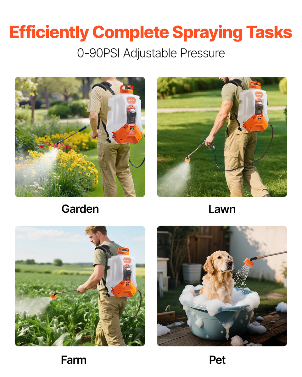 High-Pressure Precision Spraying: The electric garden sprayer comes with adjustable 0-90 PSI pressure allows for easy switching between mist and stream modes. This battery-powered backpack sprayer ideal for gardening and cleaning tasks.