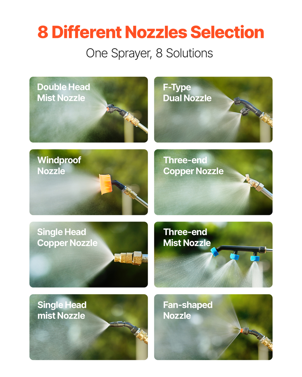 Professional Accessories Kit: Includes 8 different nozzles and a dual-material spray rod, making the lawn sprayer versatile enough to tackle more than 10 spraying applications.