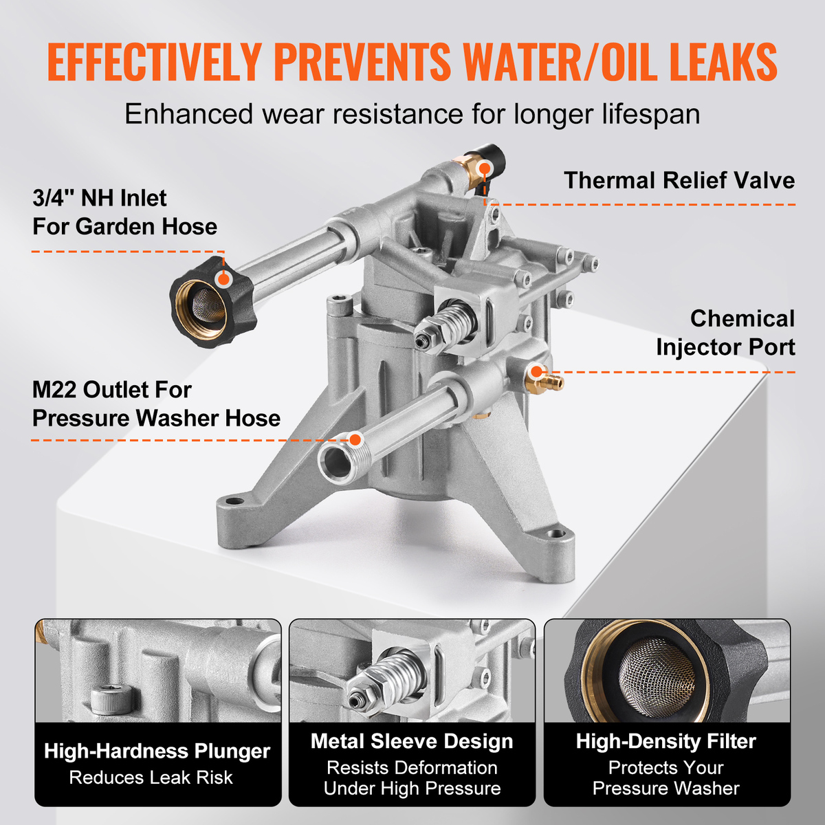 Maintenance-Free Design: This replacement pump for power washer features a maintenance-free crankcase, eliminating the need for oil changes. Ideal for 2500-3000 PSI and 2.5 GPM electric washers, it is perfect for cleaning walls, fences, sidewalks, vehicles, and more.