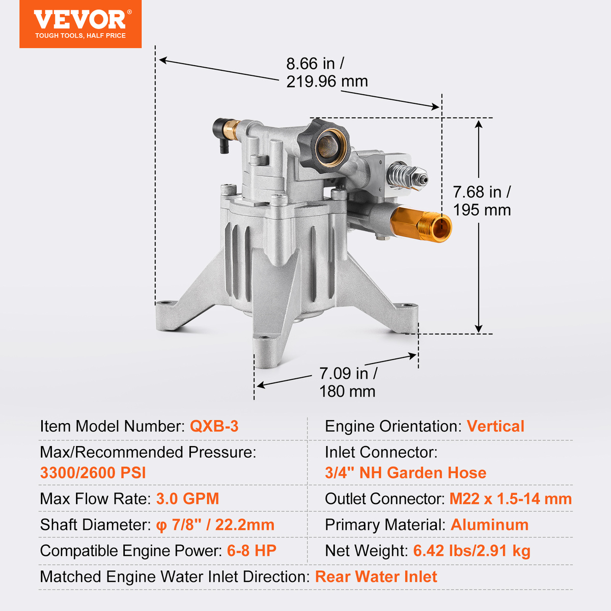 Strong Compatibility: Designed for 7/8-inch vertical shaft rear-outlet engines, this power washer pump fits most 196-230cc 6HP-8HP engines with a standard SAE bolt pattern, making pump replacements easy and efficient.