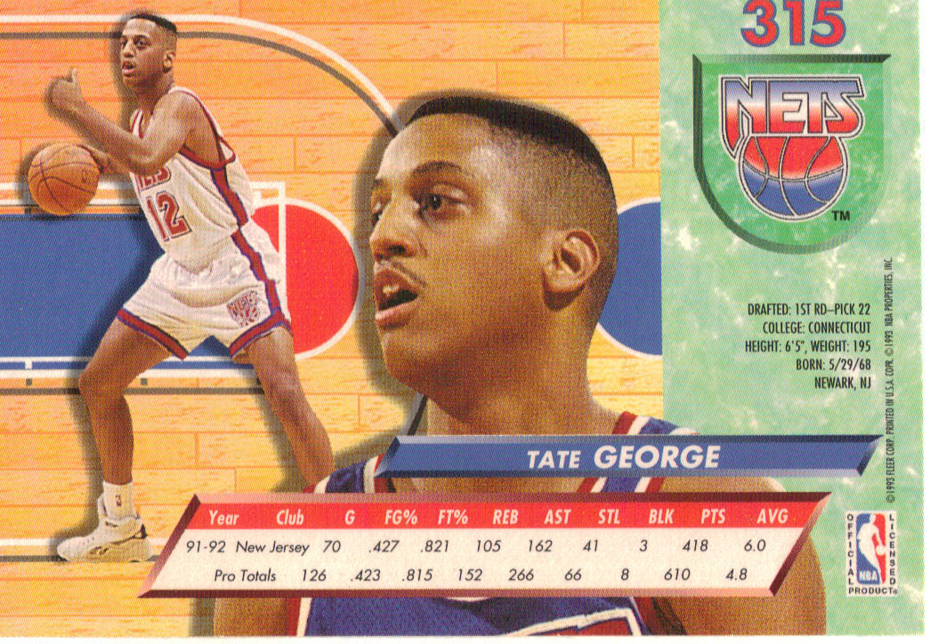 M) 1992-93 Fleer Ultra Basketball Trading Card Tate George #315 New Jersey Nets