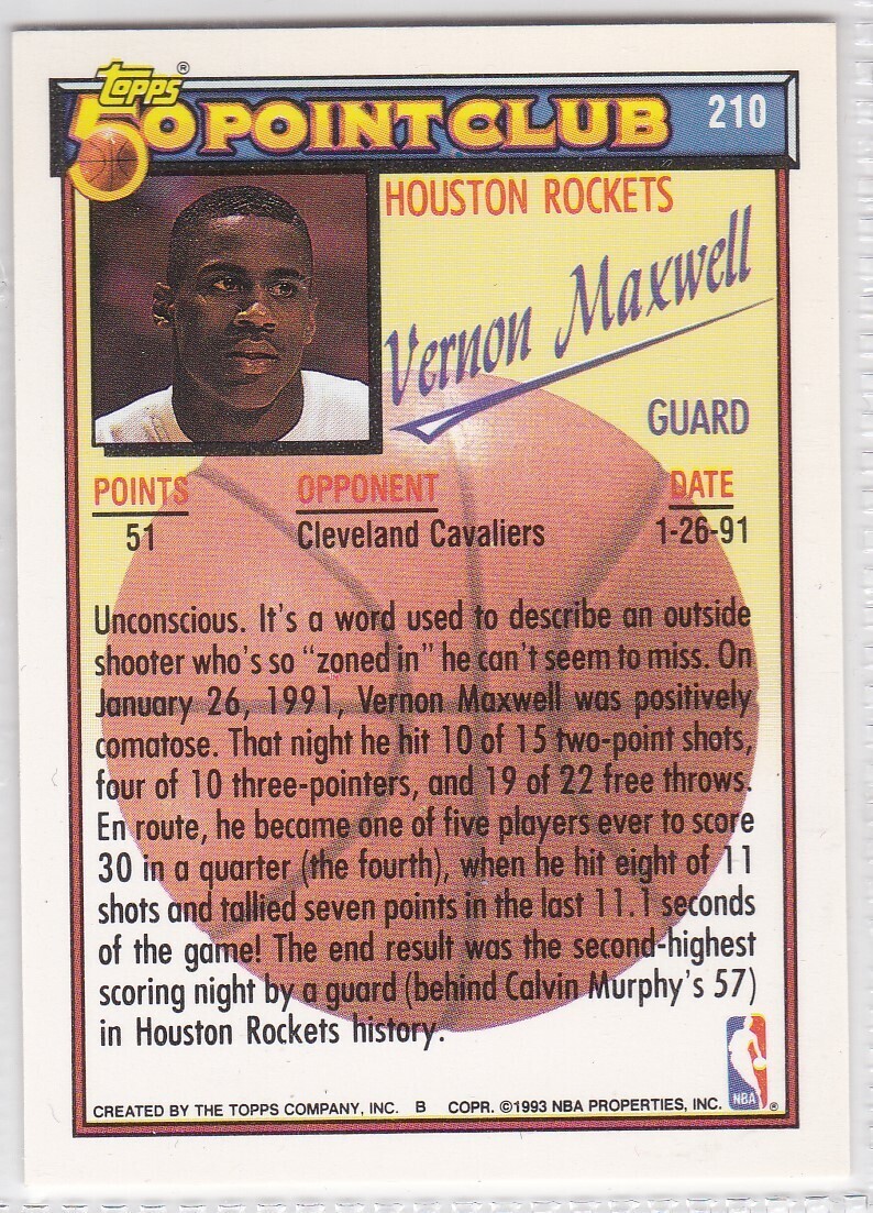 M) 1992-93 Topps Basketball Trading Card - Vernon Maxwell #210
